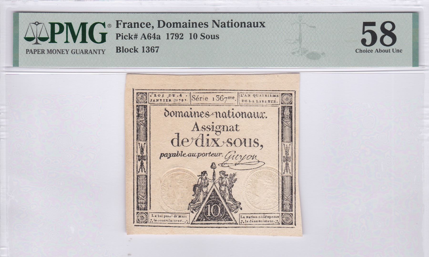 France, 1792, 10 SoUs, 1367. PMG 58. Pick#A64a. Rare. Only 24 pcs graded.