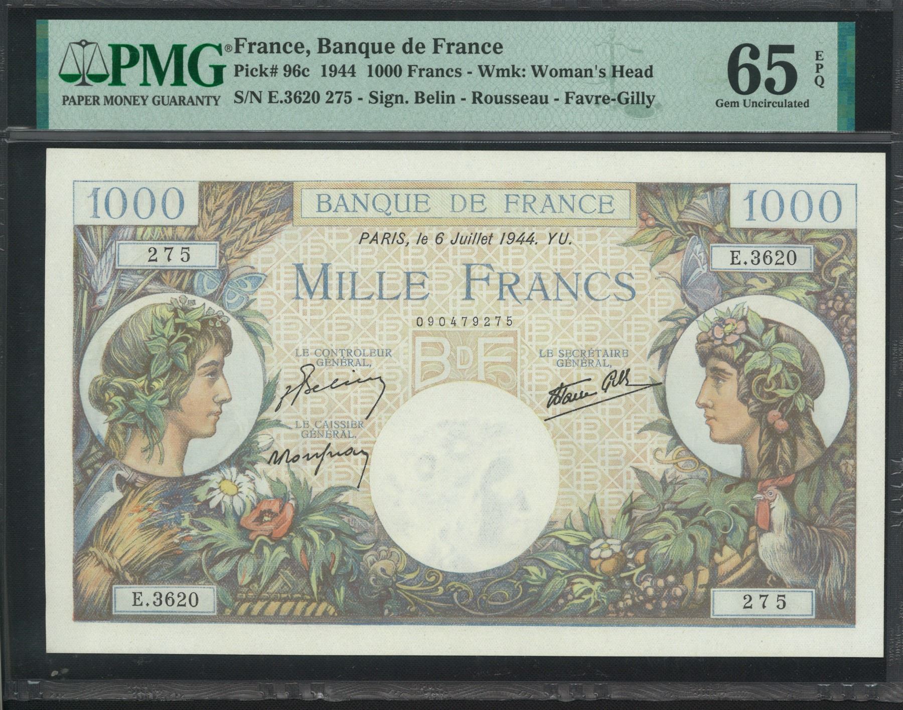 1944, 法國 1000 法郎, 編號: E.3620 275. PMG 65EPQ.