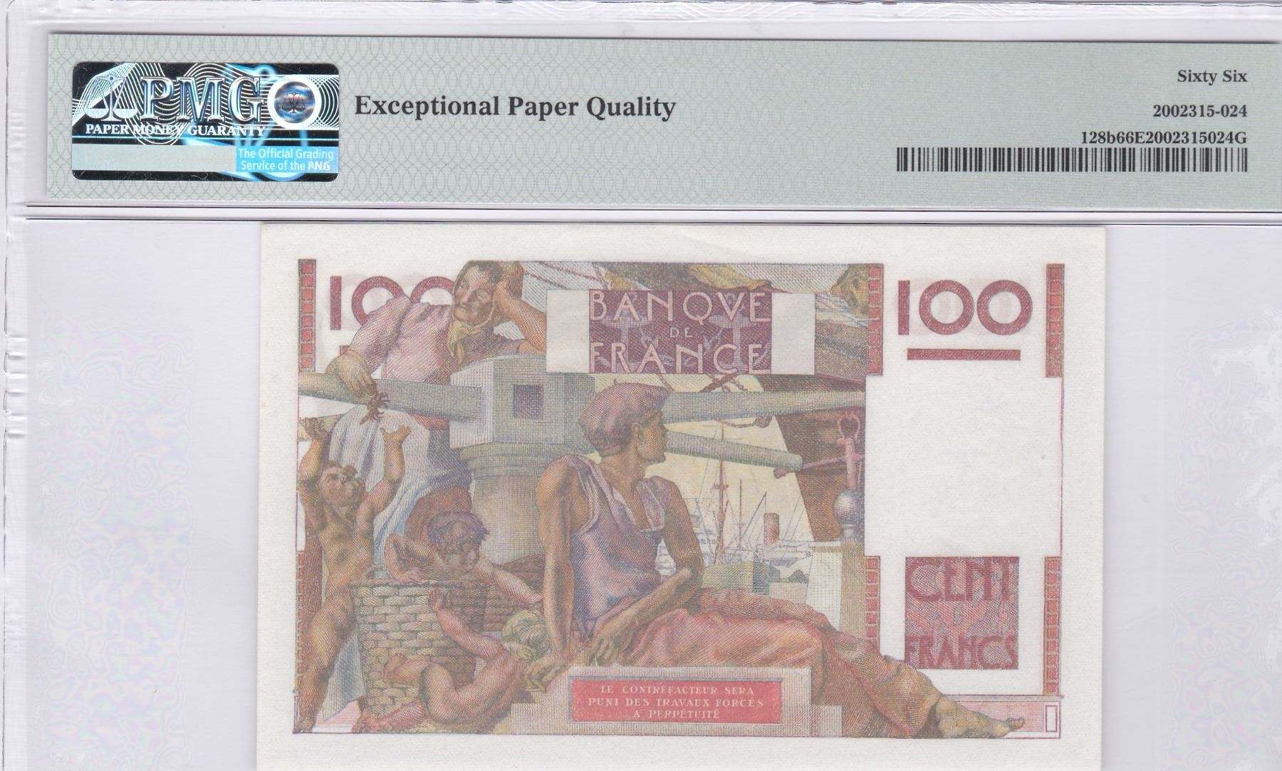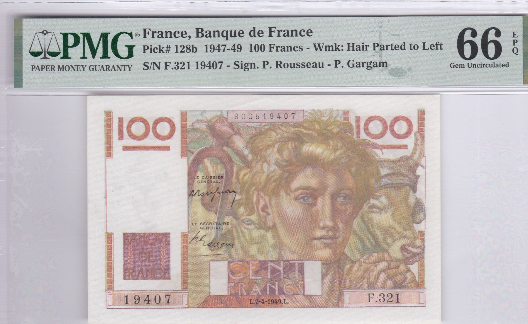1949, 法國, 100 法郎, 編號: F. 321 19407. PMG 66EPQ.