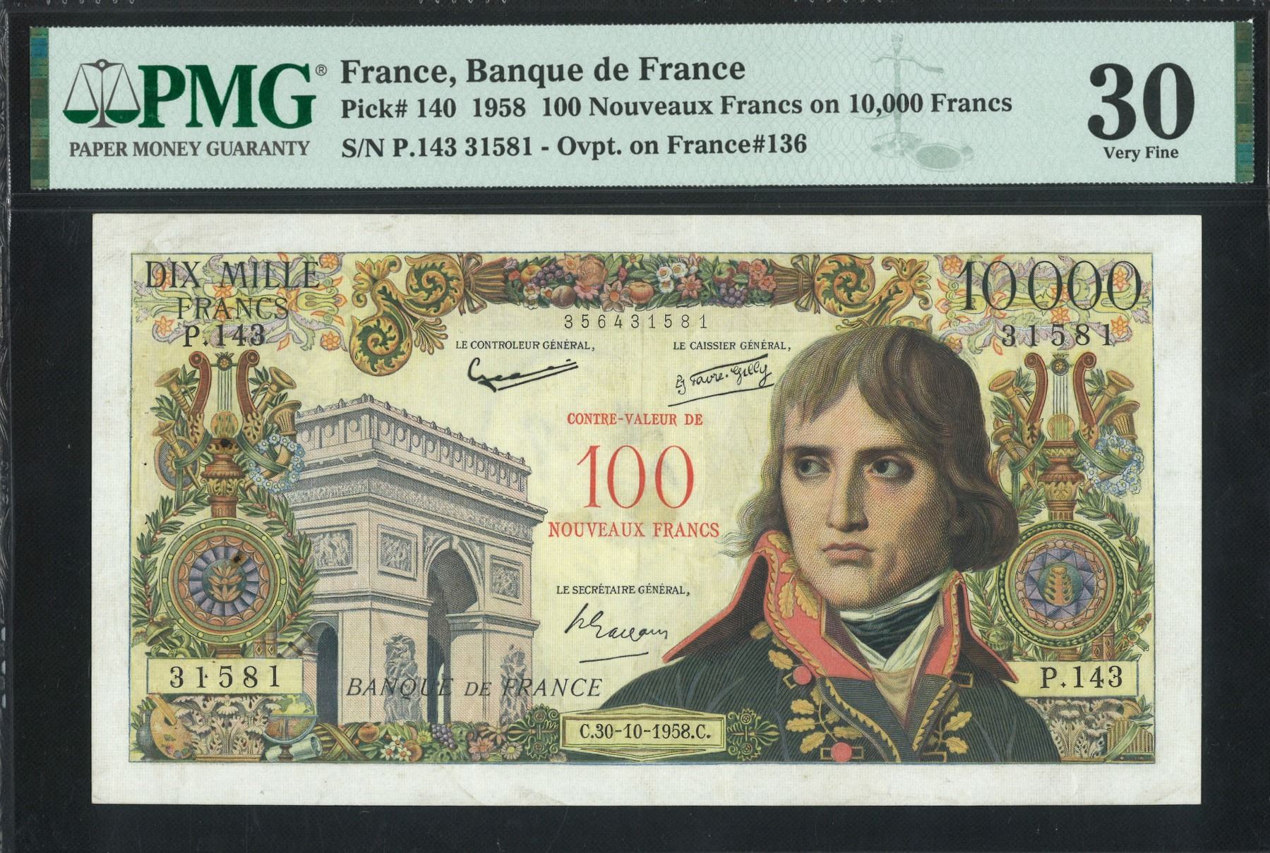 France, 1958, overprinted 100 Nouveaux Francs on 10,000 Francs, P.143 31581. PMG 30. Rare overprinte