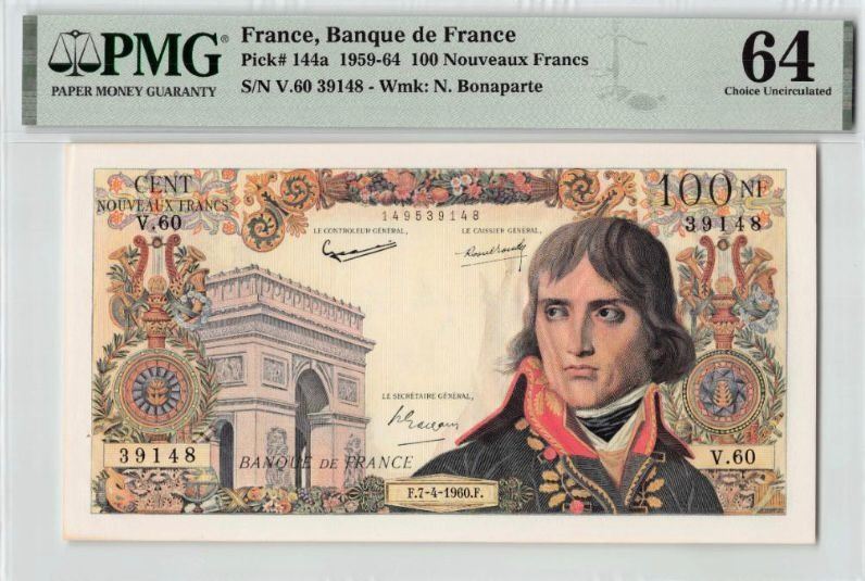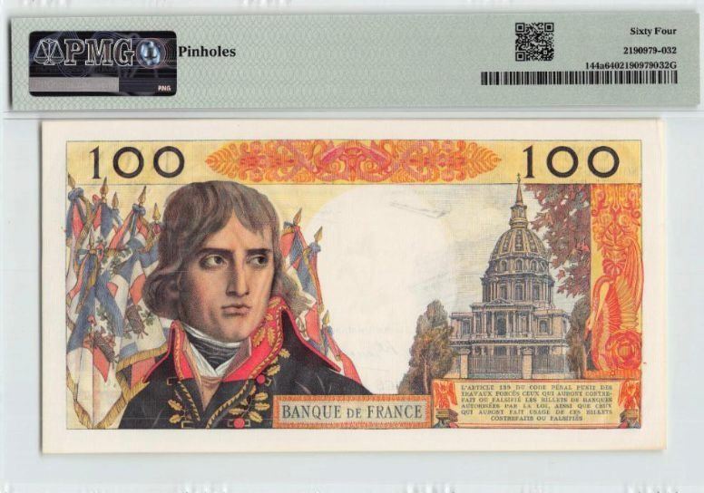 1960, 法國, 100 法郎, 編號: V.60 39148. PMG 64. 有釘孔