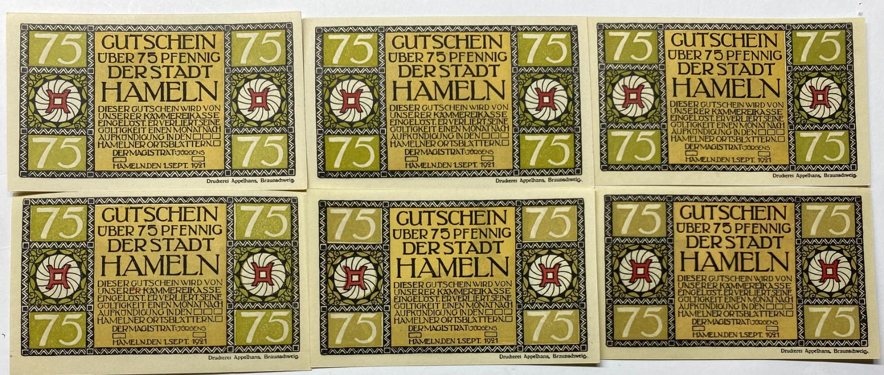1921, 德國- 哈默爾恩 , 一套6 張50 芬尼緊急票 (共6張)