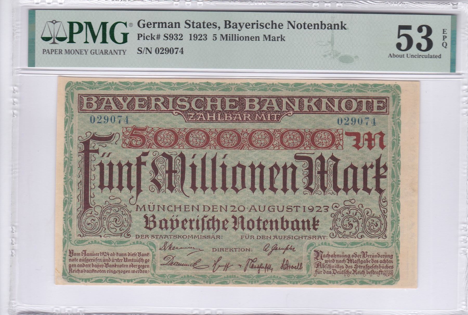 1923, 德國巴伐利亞銀行, 5百萬馬克, 編號: 029074. PMG 53EPQ.