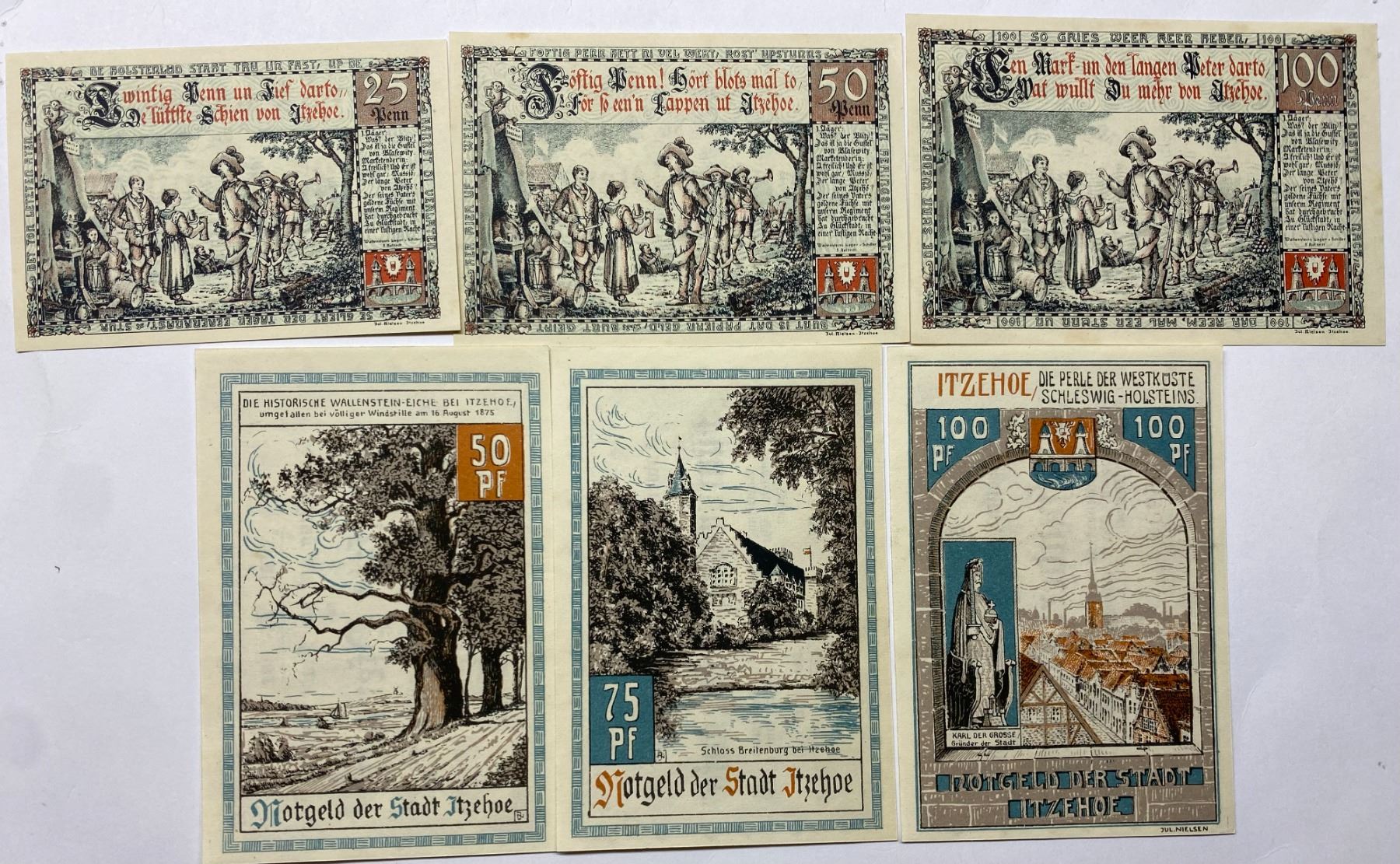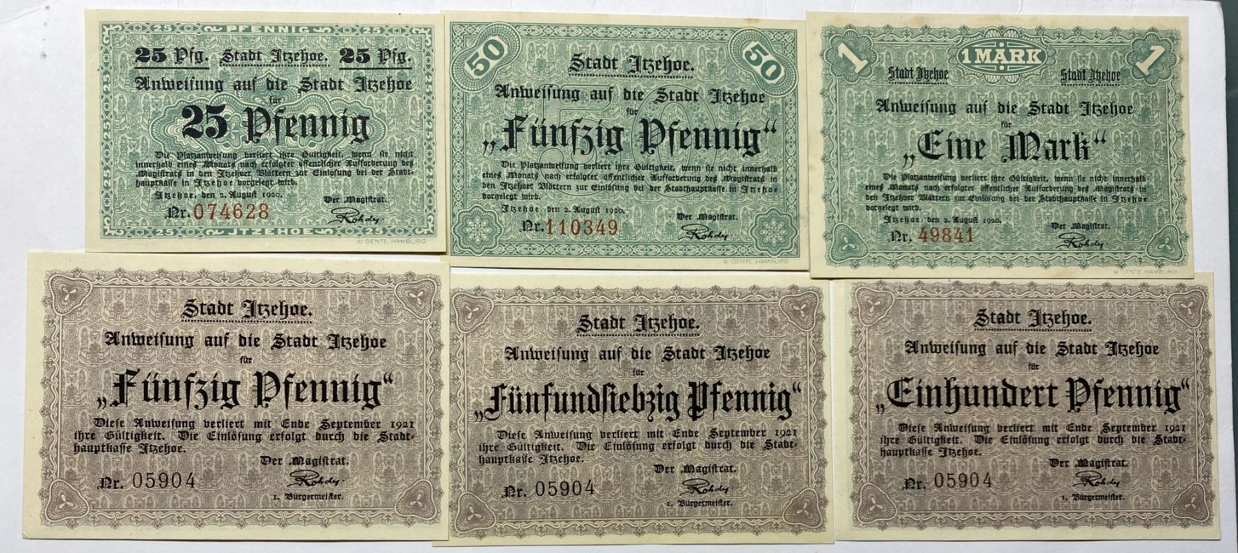 1921, 德國, 兩套不同各3 張25, 75, 100 芬尼緊急票 (共6張)