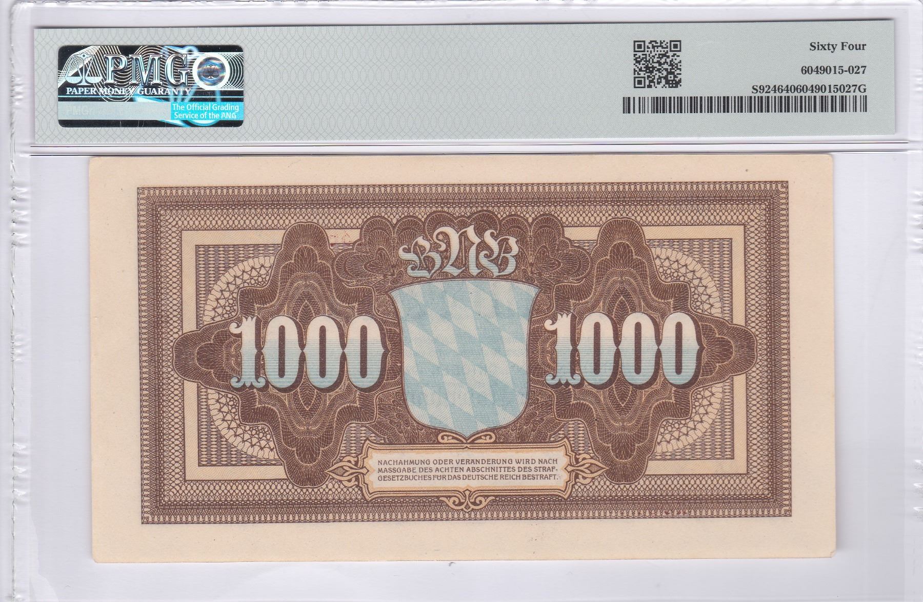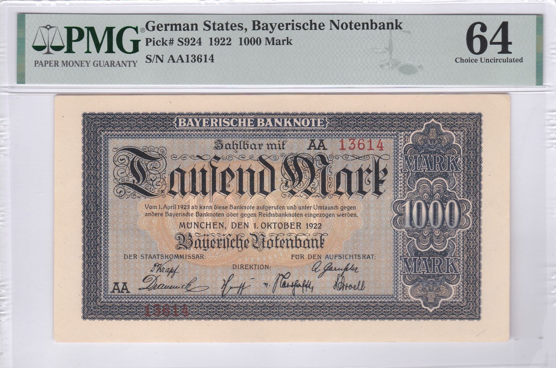 1922, 德國巴伐利亞銀行, 1000馬克, 編號: AA13614. PMG 64.