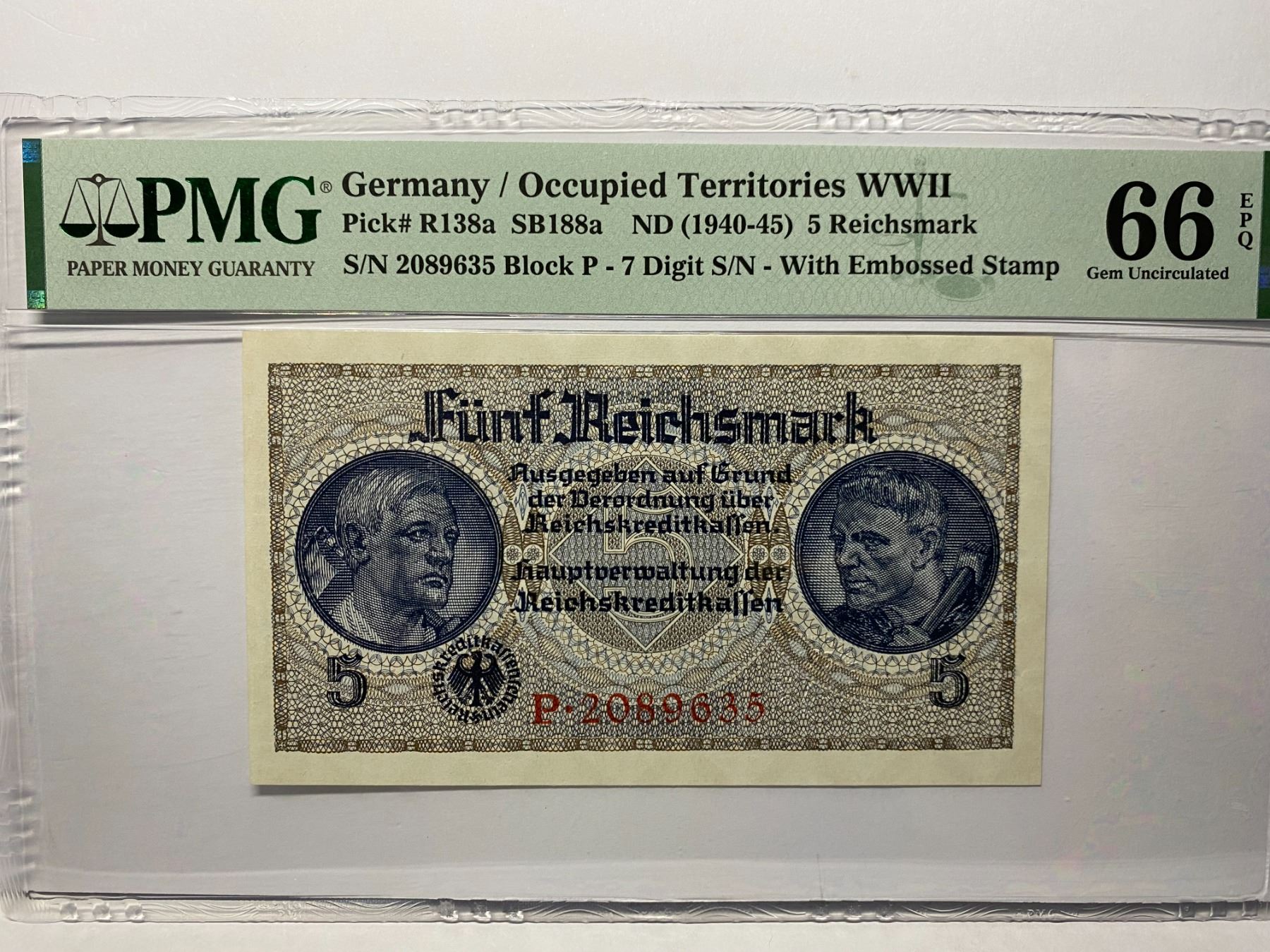 2089635, Block P, ND 1940-45 德國, 5 Reichsmark, PMG 66EPQ, 2089635, Block P, ND 1940-45 Germany/Occupied Territories WWII, 5 Reichsmark, PMG 66EPQ