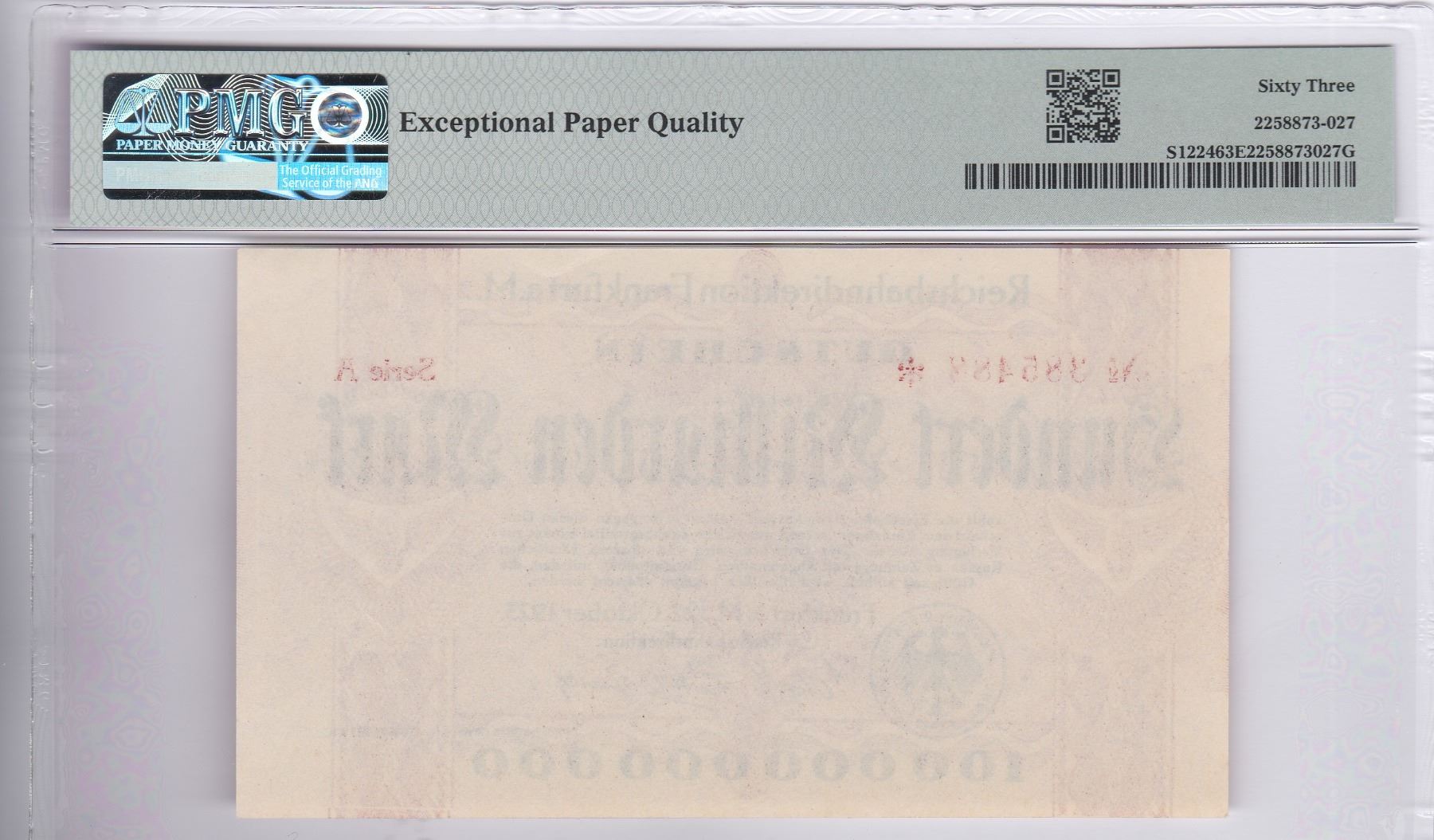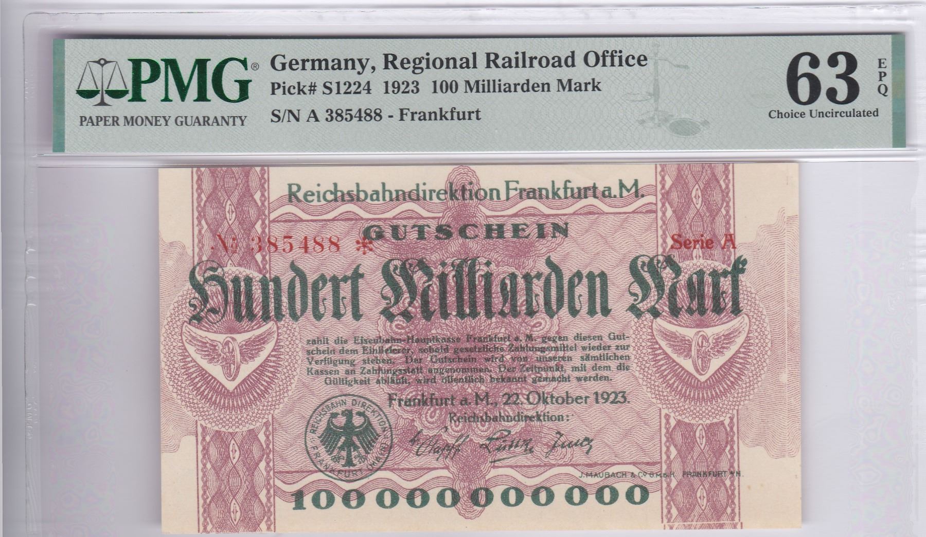 1923, 德國地區鐵路公司, 一千億萬馬克, 編號: A385488. PMG 63EPQ. 罕有, 全PMG紀錄只有3 張評級鈔出現