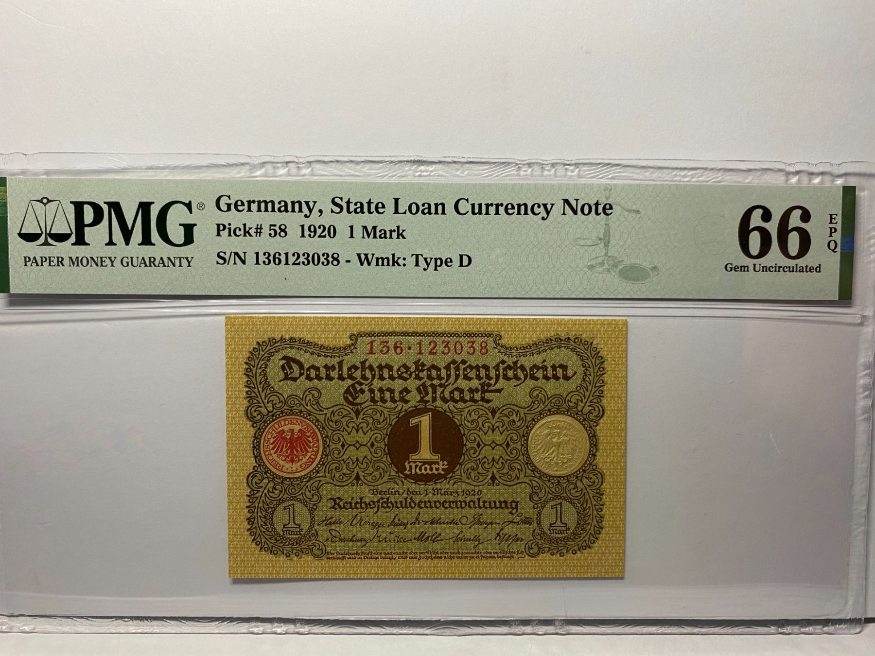 136123038, 1920 德國, 1馬克, PMG 66EPQ, 136123038, 1920 Germany, State Loan Currency Note, 1 Mark, PMG 66EPQ
