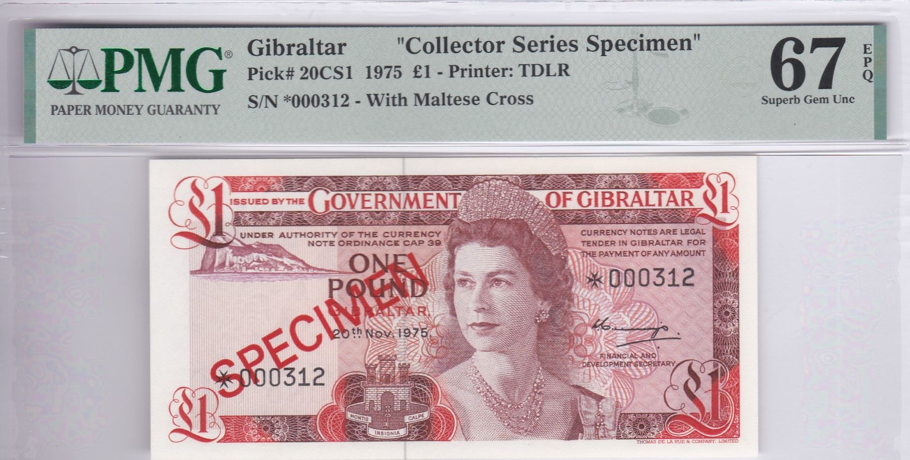 1975, 直布羅陀, 1鎊, 樣票, 編號: *000312. PMG 67EPQ.