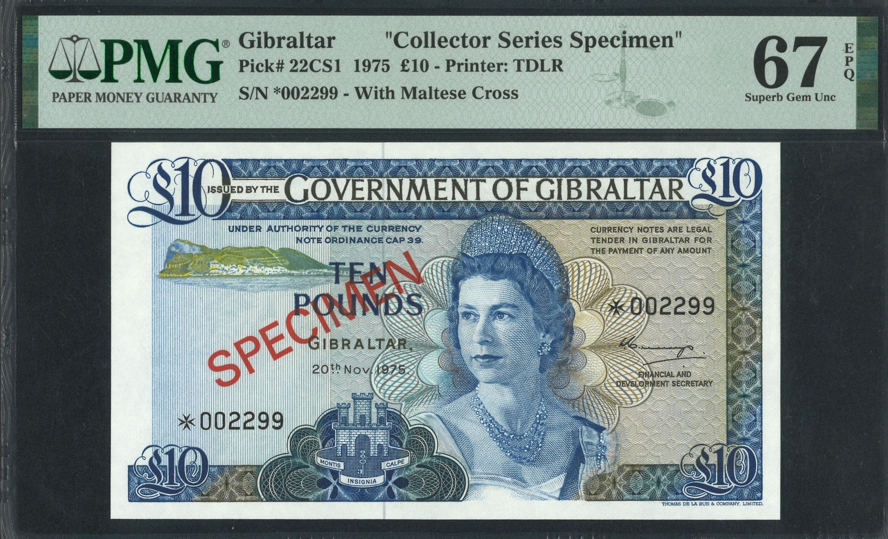 1975, 直布羅鉈, 10 鎊, 收藏家系列樣票, 編號: *002299, PMG 67EPQ. 對子號