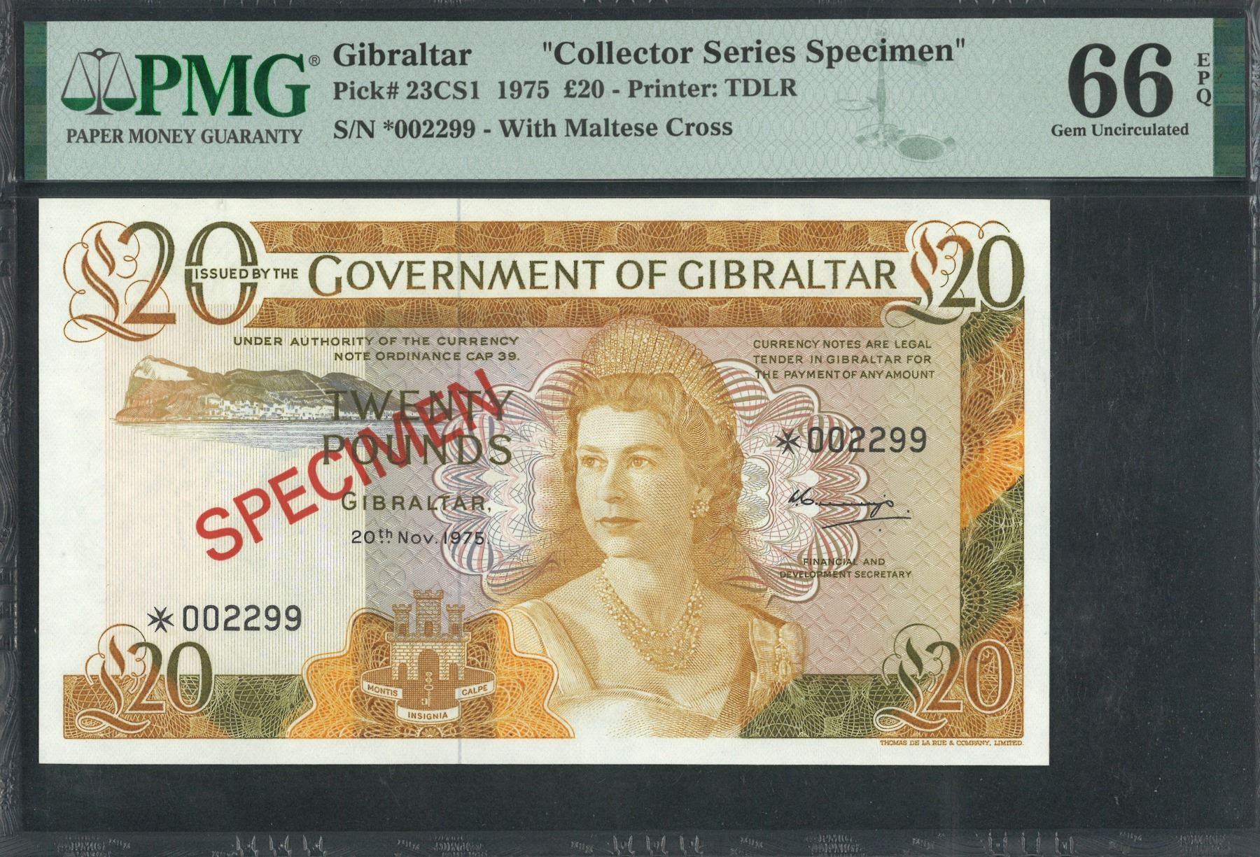 Gibraltar, 1975, 20 Pounds, Collector Series Specimen, *002299, PMG 66EPQ. Pairs S/N.