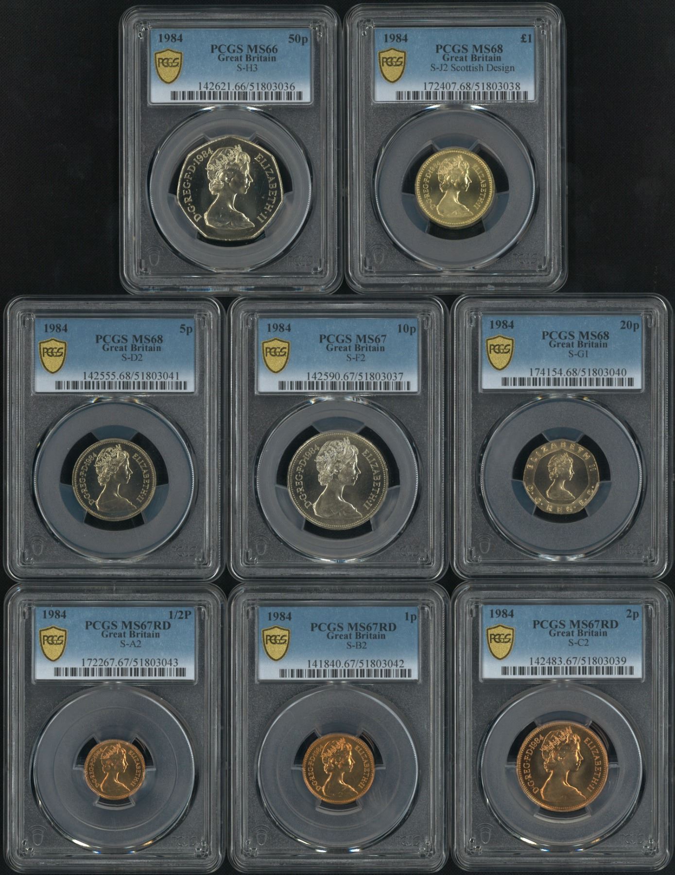 1984, 英國普鑄幣套裝, 一套8 枚, 包括: 0.5/ 1/ 2/ 5/ 10/ 20/ 50便士及 1 鎊, 全評 PCGS MS66 -68.