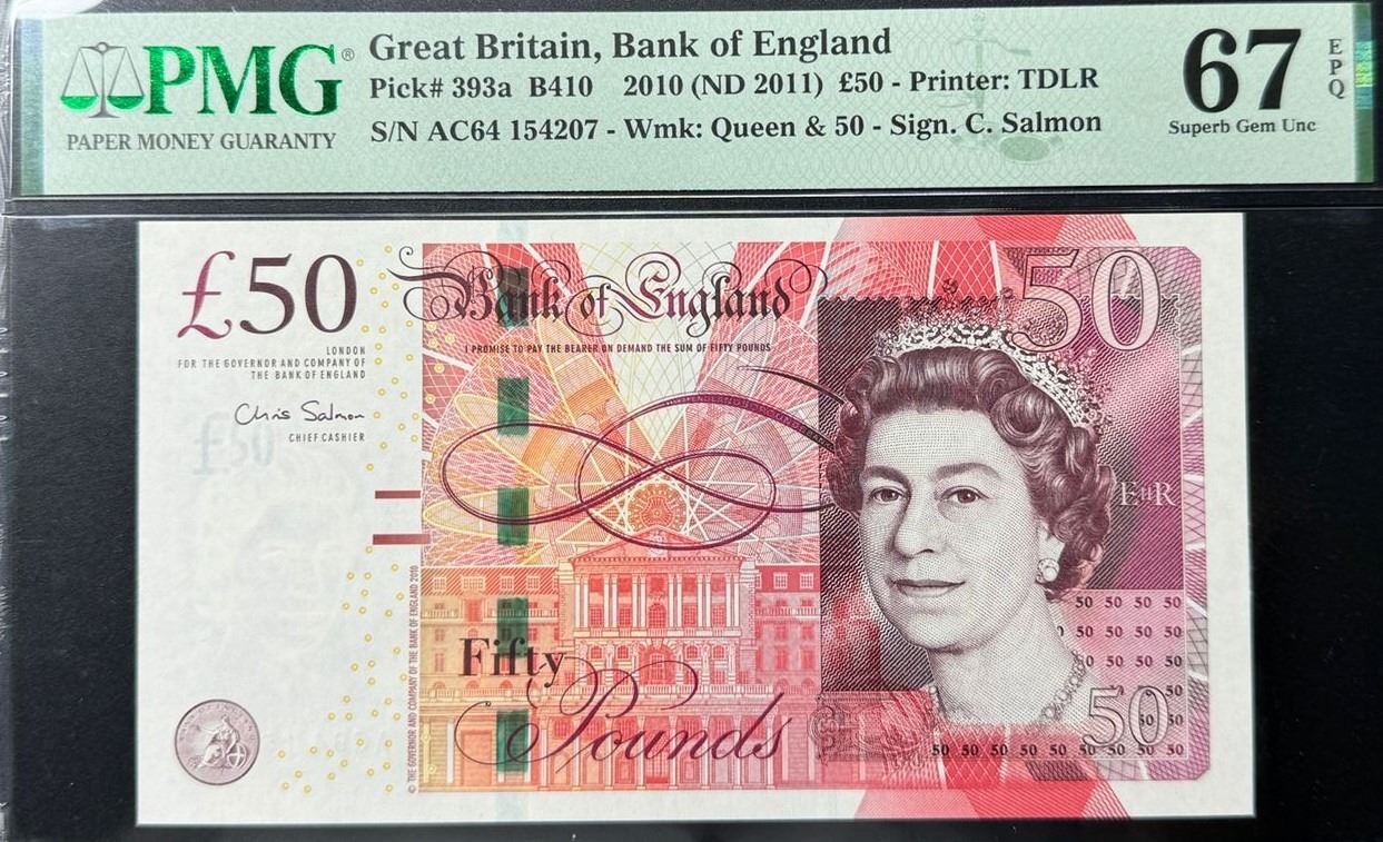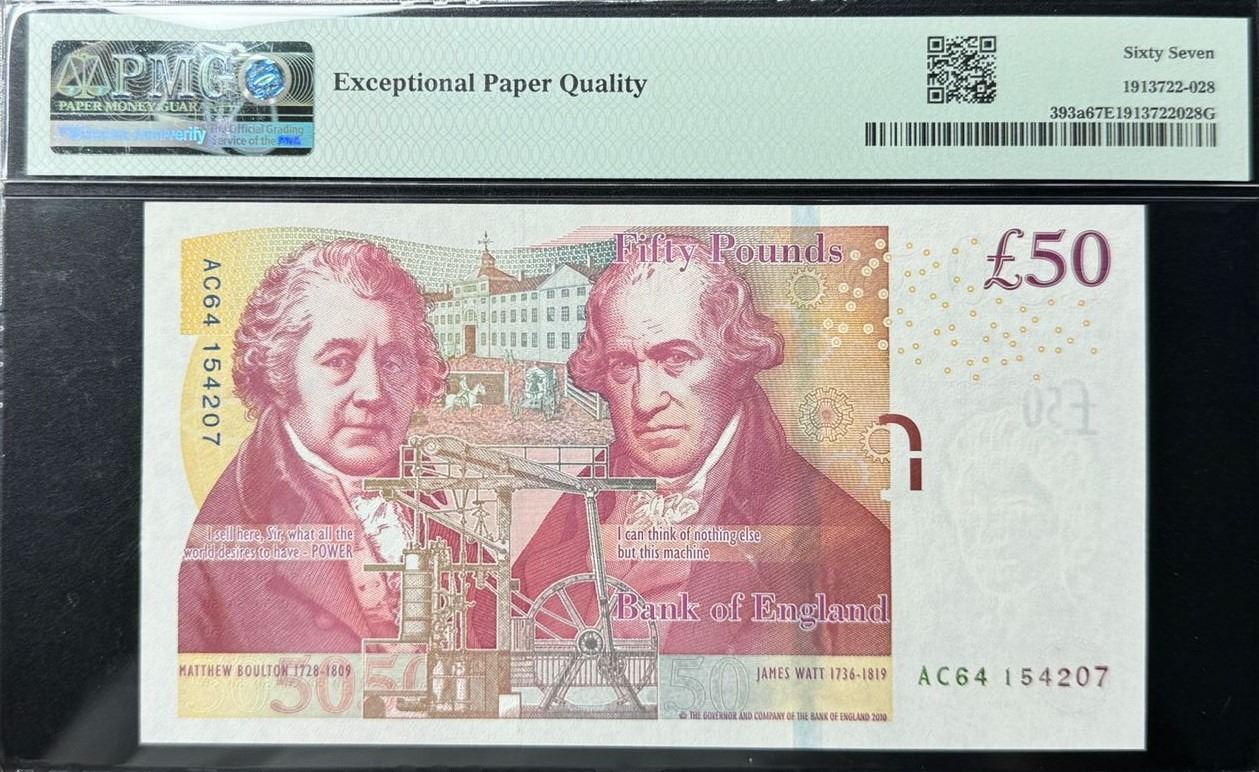 2010, ND (2011), 英國, 50 鎊, 編號: AC64 154207. PMG 67EPQ. 最後一版紙鈔 67EPQ 高分