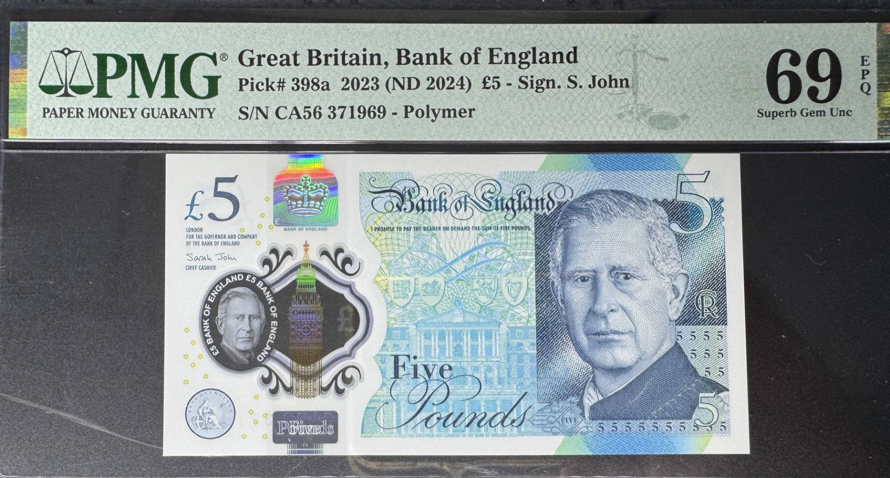 2023 (ND 2024), 英國查里三世, £5, 編號: CA56 371969. PMG 69EPQ.