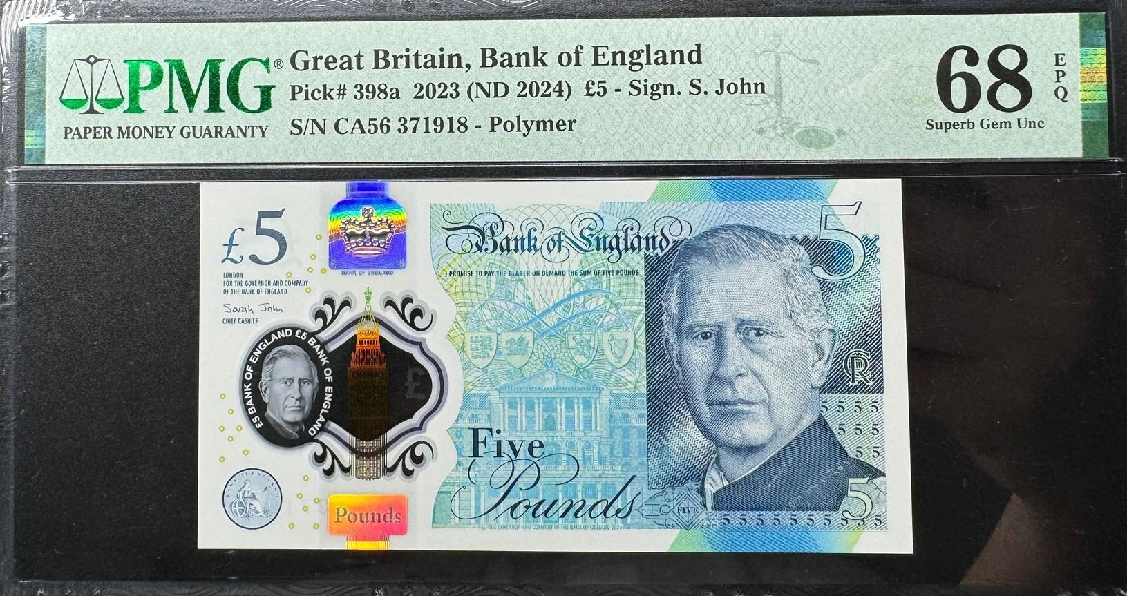 2023 (ND 2024), 英國(最新發行查理三世), 5 鎊, 編號: CA56 371918. PMG 68EPQ.