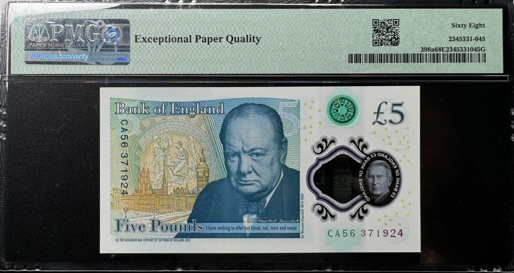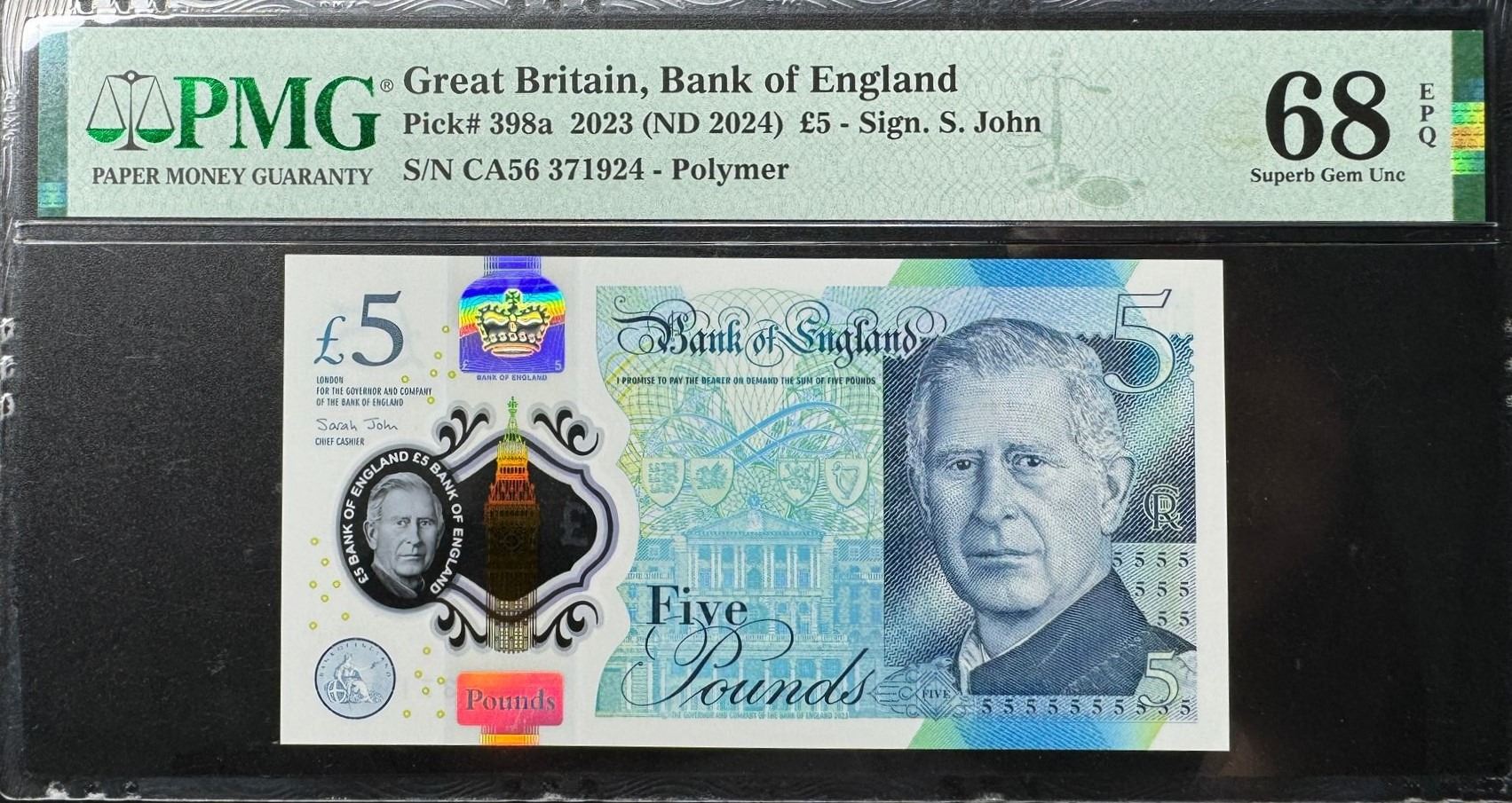 2023 (ND 2024), 英國(最新發行查理三世), 5 鎊, 編號: CA56 371924. PMG 68EPQ.