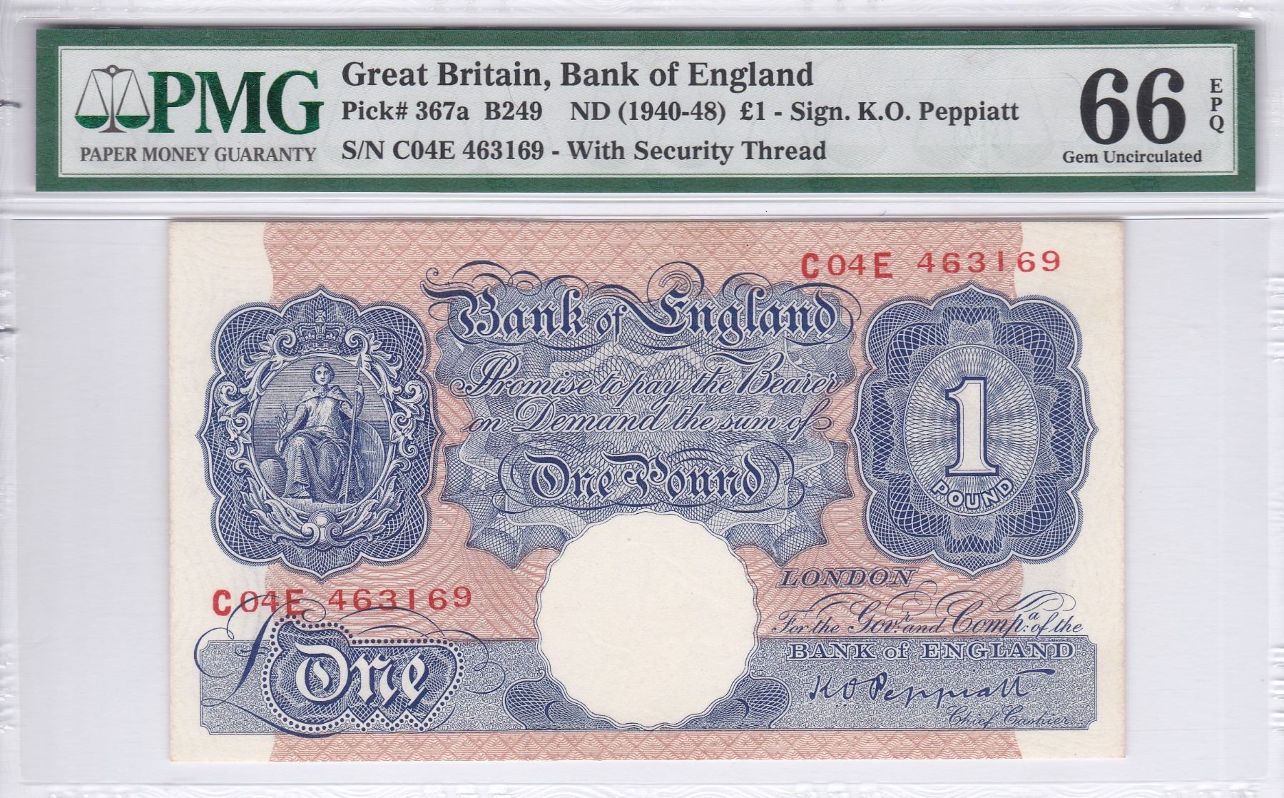 ND (1940 -48), 英國, 1 鎊, 編號: C04E 463169 PMG 66EPQ. 少有高分