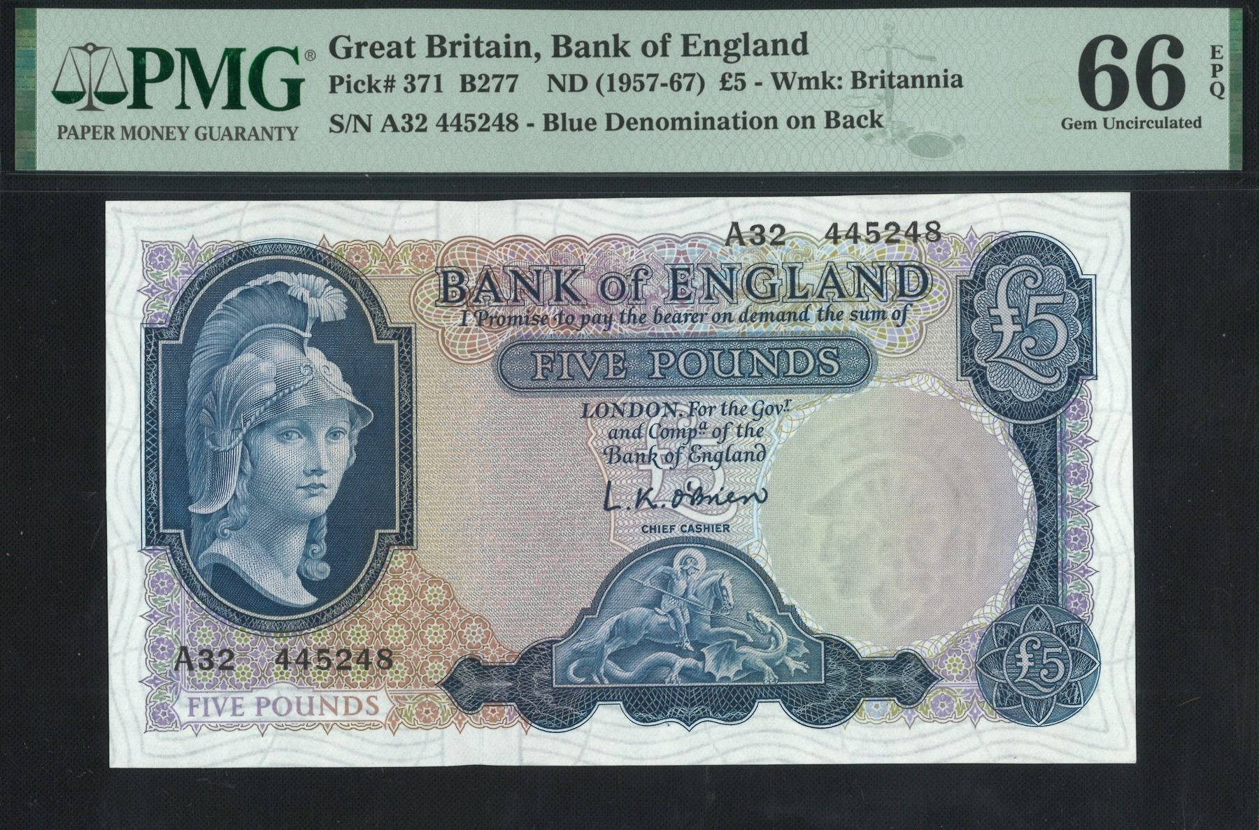 ND (1957 -67), 英國, £5, 編號: A32 445248. PMG 66EPQ.