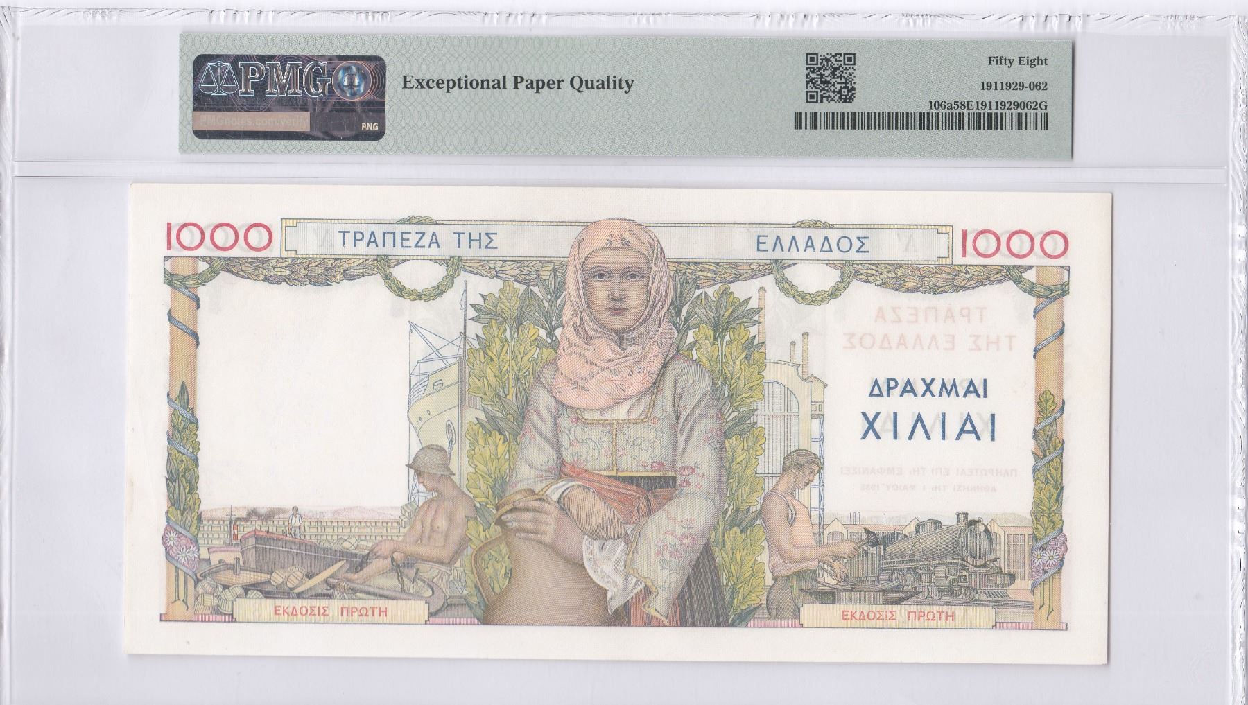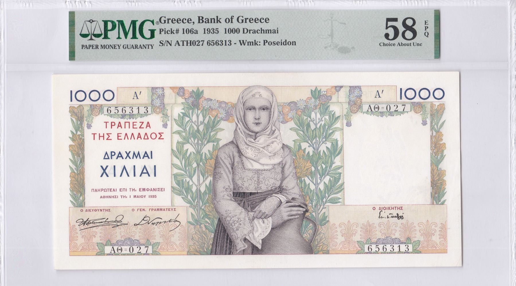 1935, 希臘, 1000 德拉克馬, 編號: ATH027 656313. PMG 58EPQ.