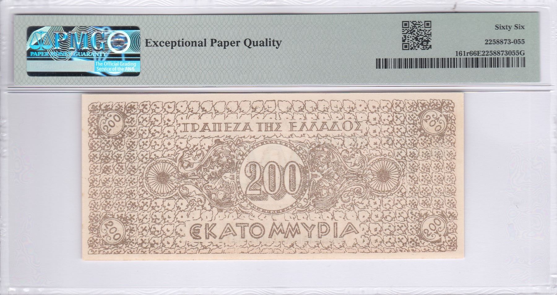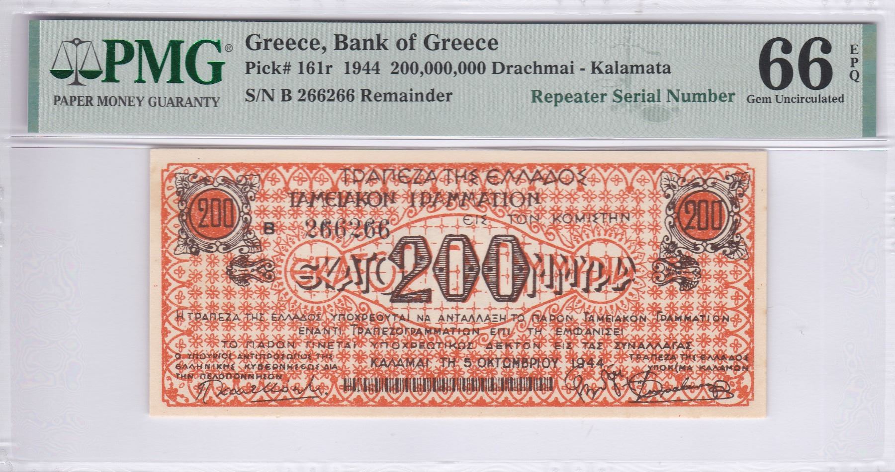1944, 希臘, 200,000,000 德拉克馬, 編號: B266266. PMG 66EPQ. 庫存票, 重覆號