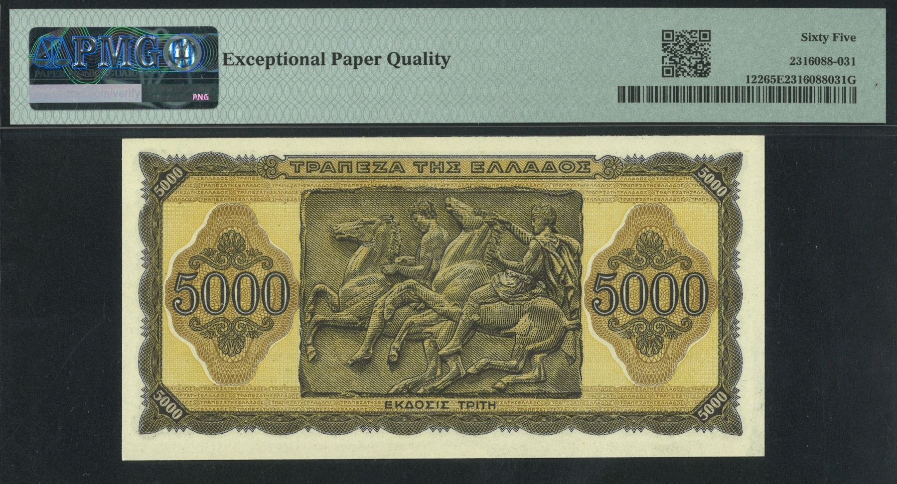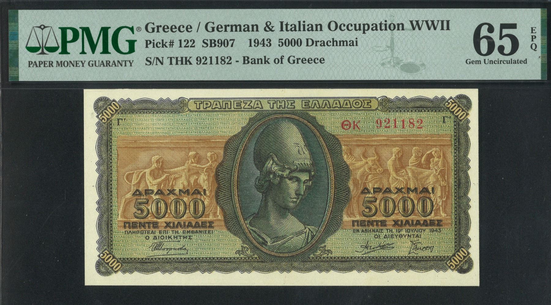 1943, 希臘德佔時期, 5000 德拉馬克, THK 921182. PMG 65EPQ.