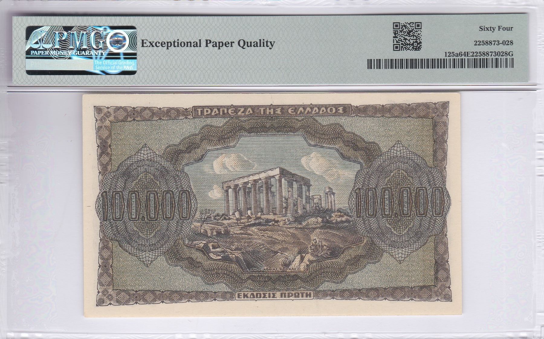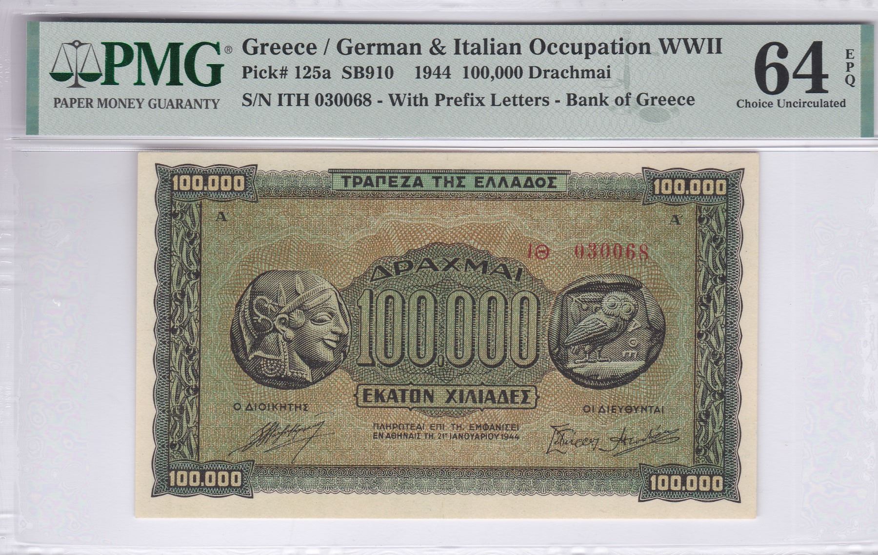 1944, 希臘, 二戰德意佔領時期, 100, 000 德拉克馬, 編號: ITH030068. PMG 64EPQ.