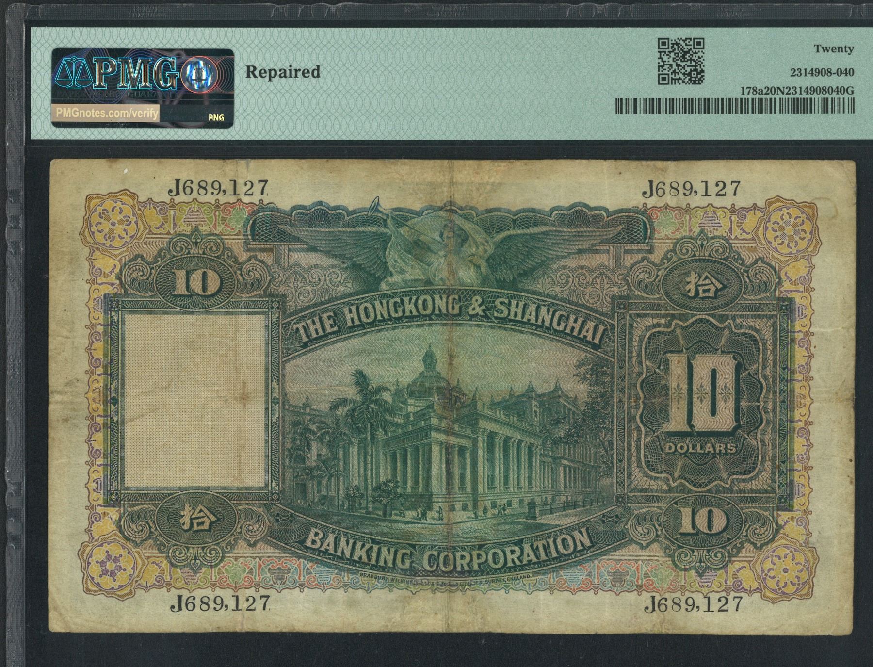 HK & Shanghai Banking Corp., 1937, $10, J689127, PMG 20NET. Repair. Hand Signed.