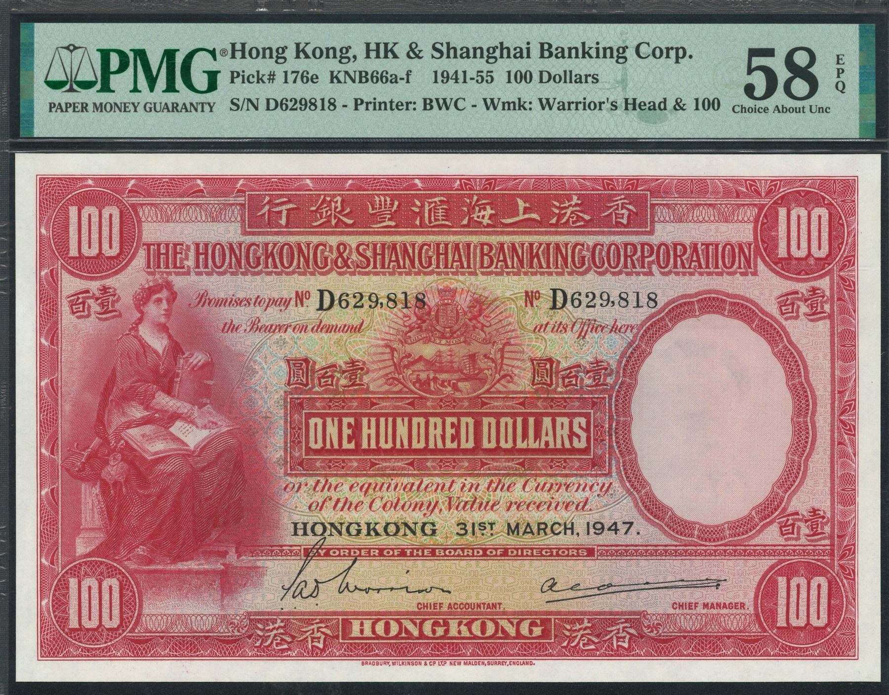HK & Shanghai Banking Corp. 1947, $100, D629818. PMG 58EPQ.