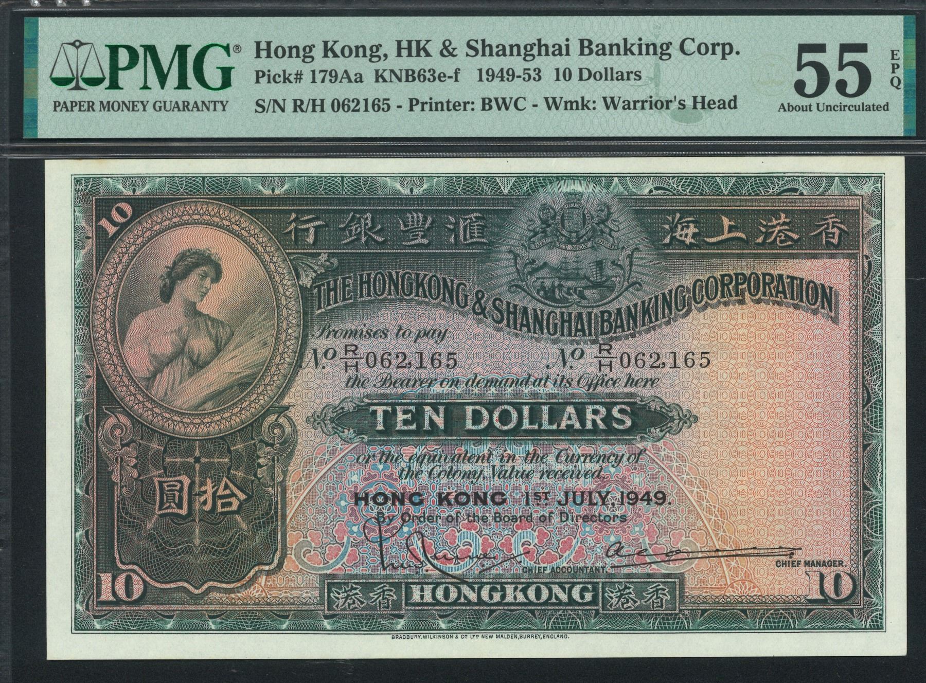 HK & Shanghai Banking Corp., 1949, $10, R/H 062165, PMG 55EPQ.