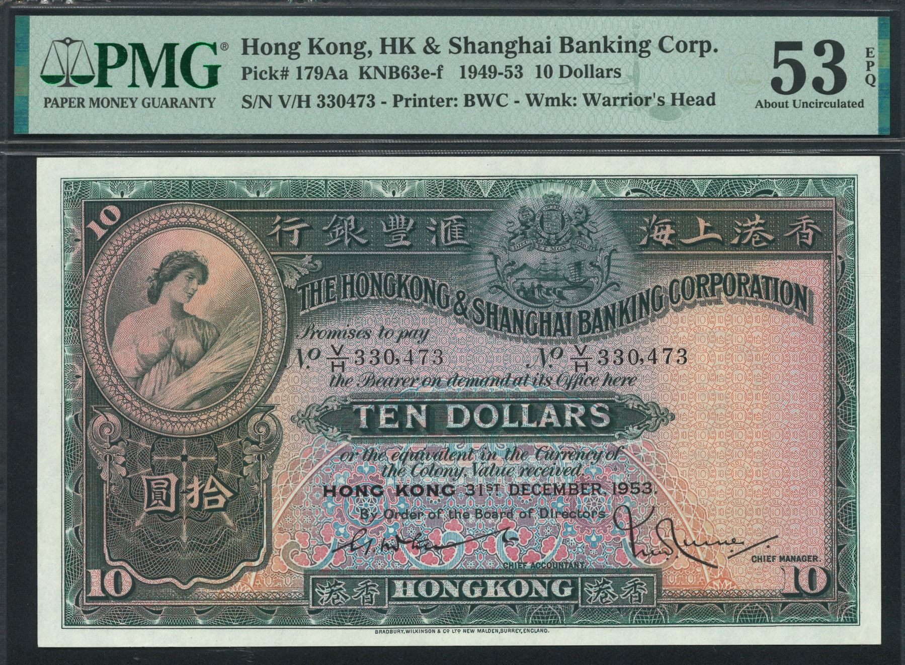 HK & Shanghai Banking Corp., 1953, $10, V/H 330473, PMG 53EPQ. Key Date.