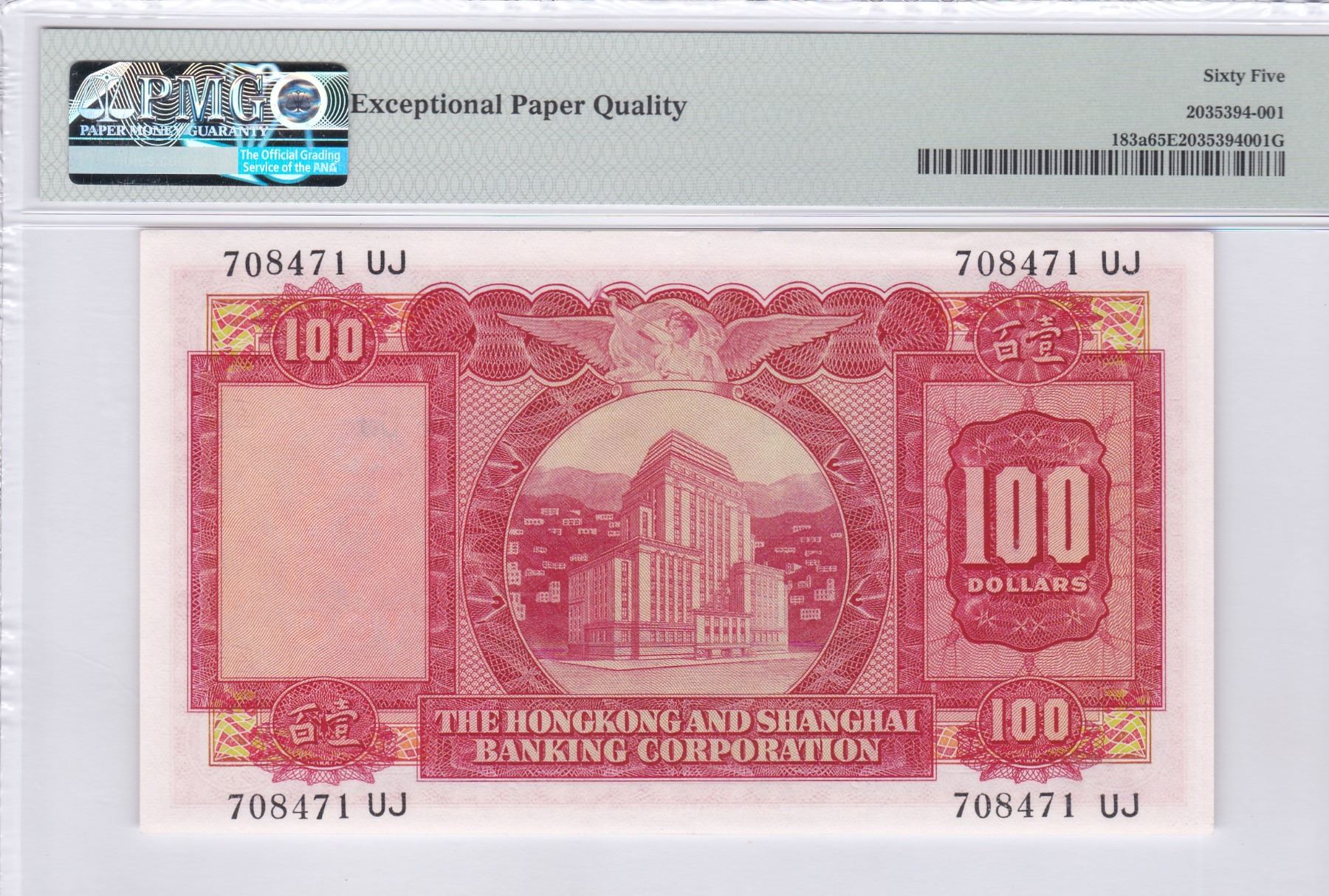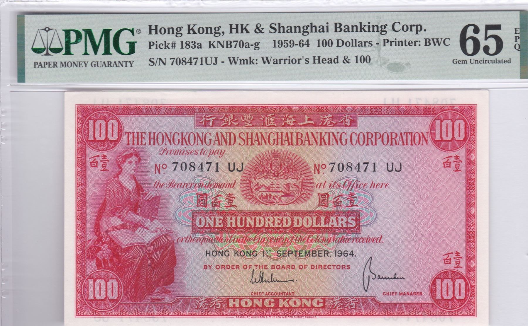 1964, 匯豐銀行, $100, 編號: 708471 UJ, PMG 65EPQ.