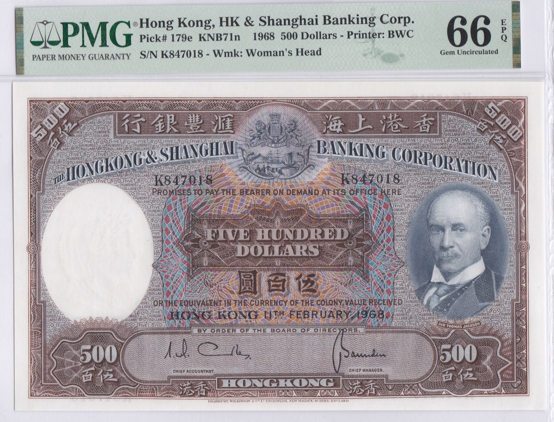 1968, 匯豐銀行, $500, 編號: K847018. PMG 66EPQ.
