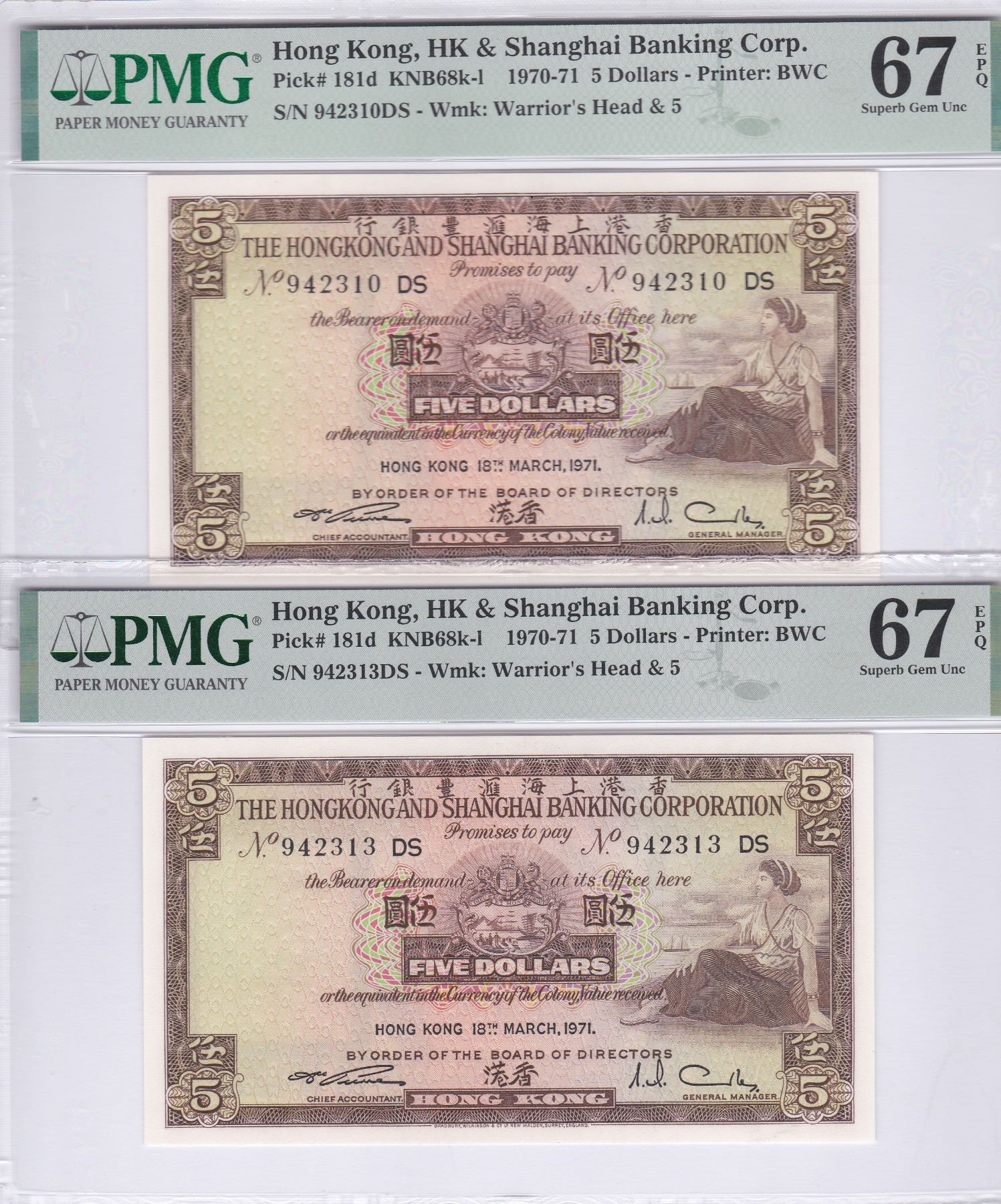 1971, 匯豐銀行, $5, 編號: 942310 DS & 942313 DS. PMG 67EPQ 兩張