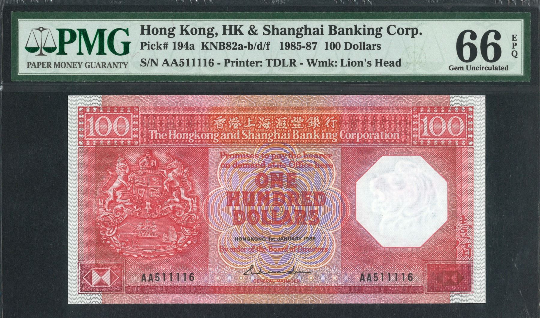 HK & Shanghai Banking Corp., 1985, $100, AA511116. PMG 66EPQ. First AA Prefix.