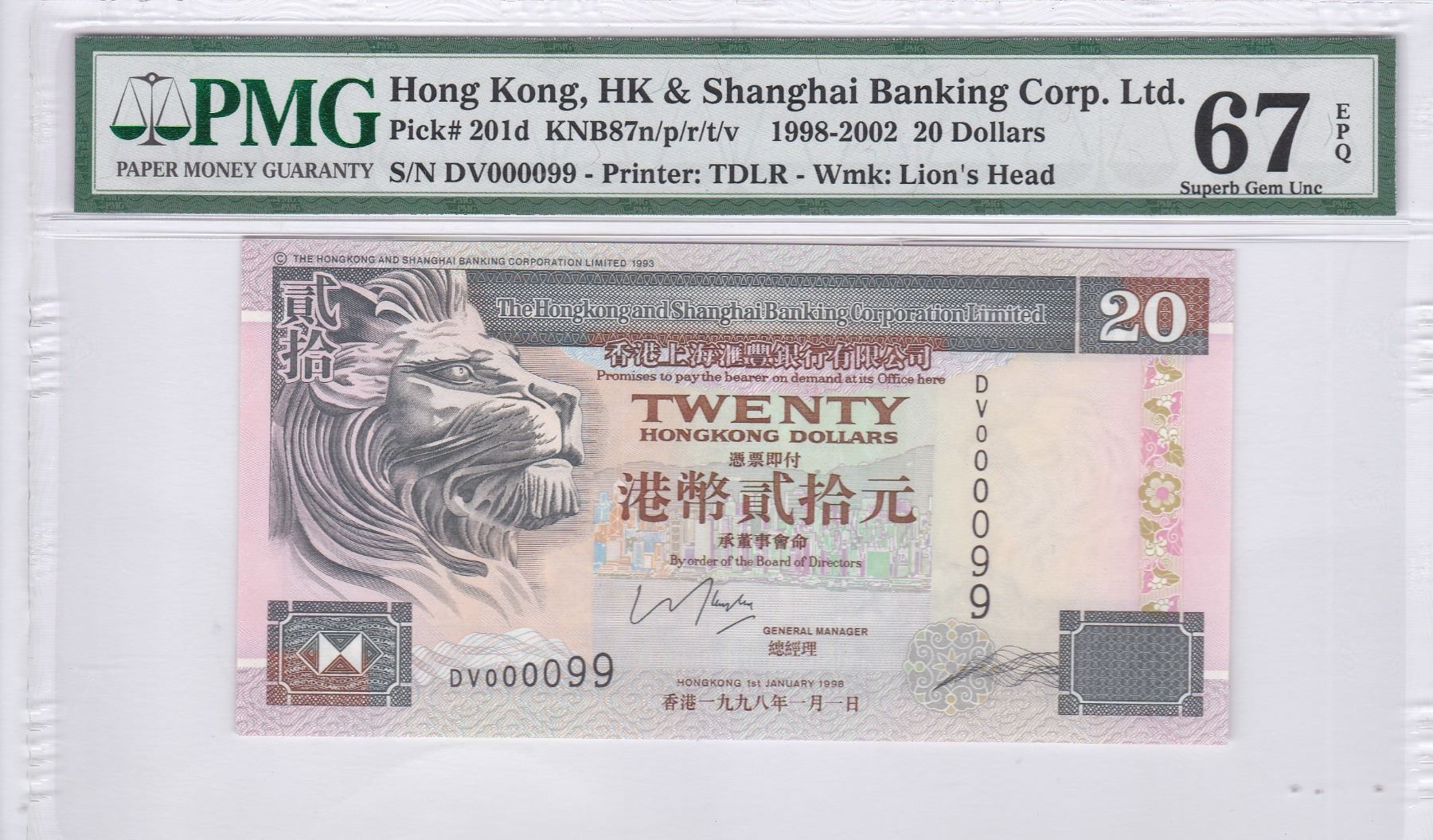HK & Shanghai Banking Corp., 1998, 20 Dollars, DV000099, PMG 67EPQ.