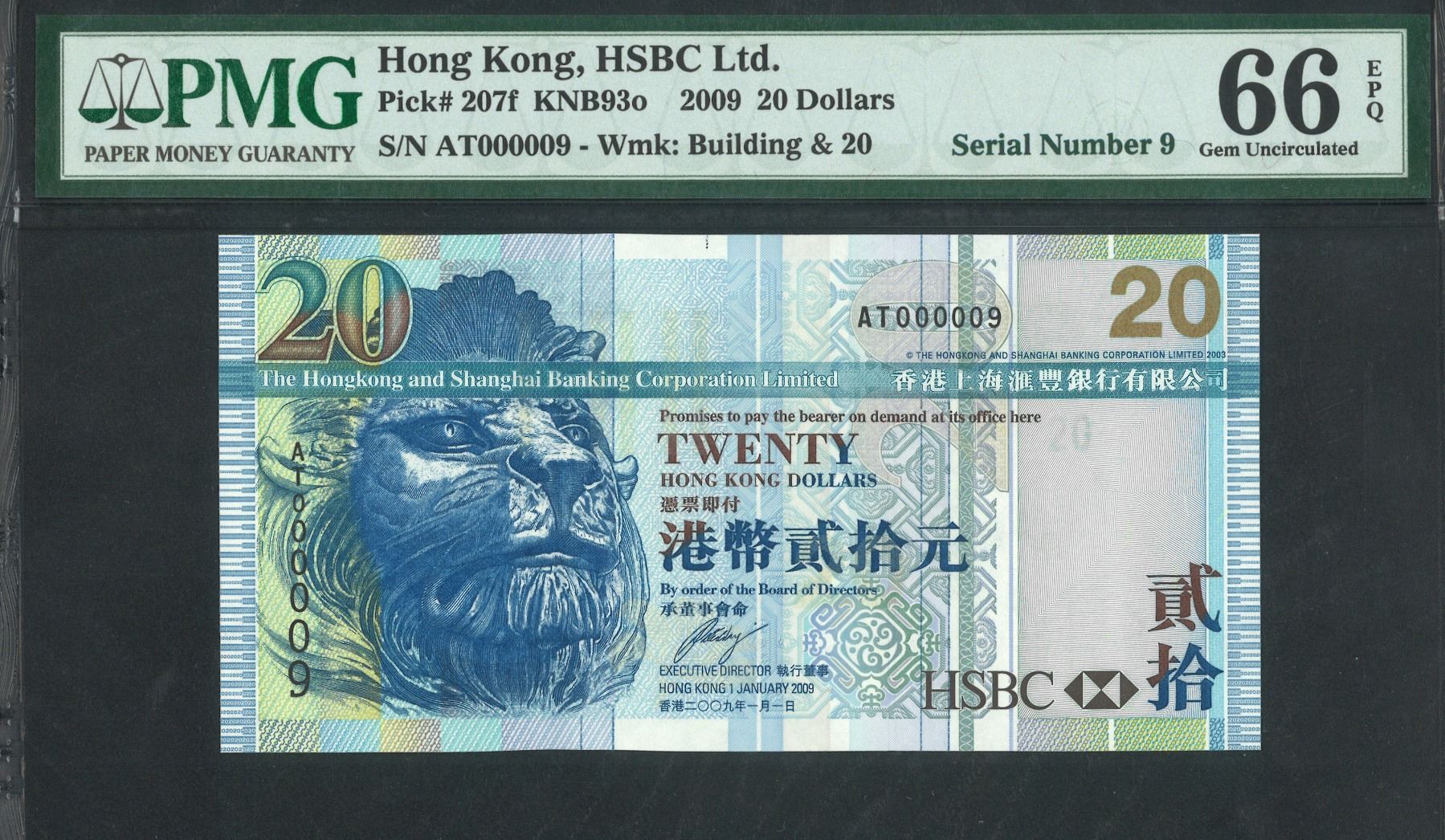 HK & Shanghai Banking Corp. 2009, $20, AT000009. PMG 66EPQ. Serial No. 9.