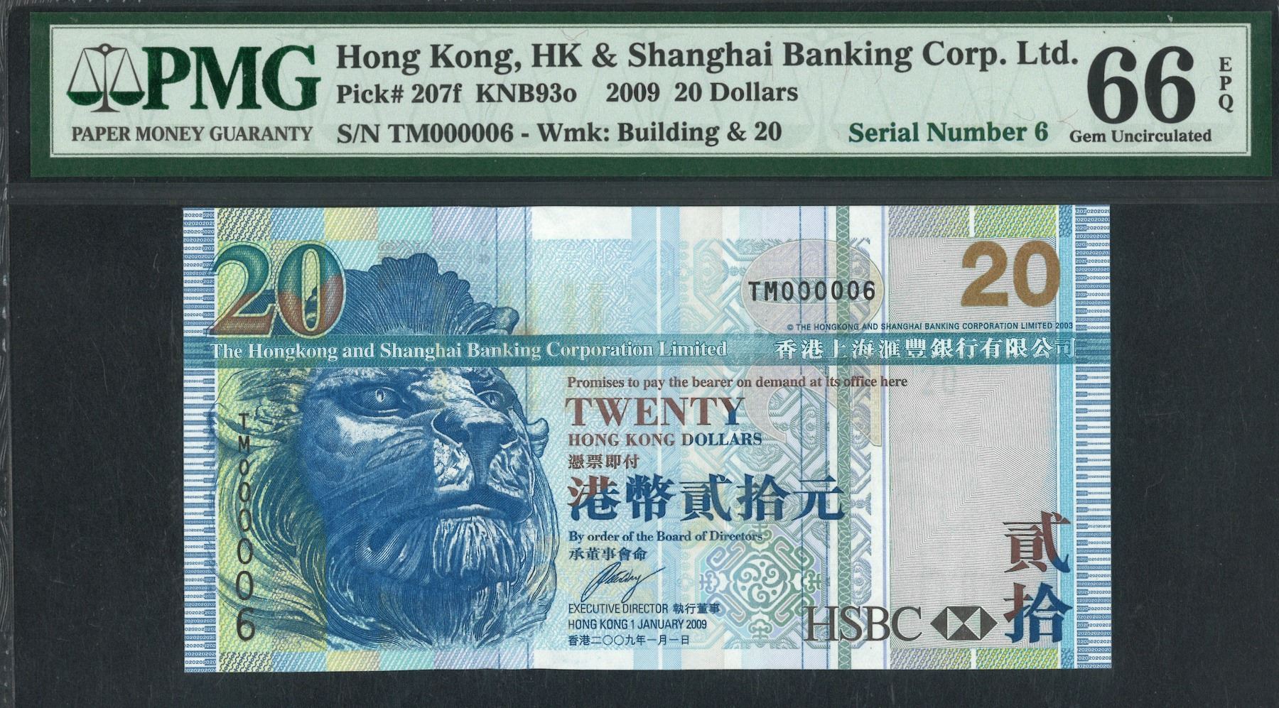 HK & Shanghai Banking Corp. 2009, $20, TM000006, PMG 66EPQ. Serial Number 6.