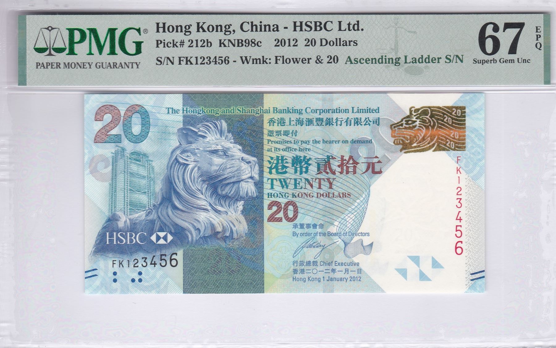 HK & Shanghai Banking Corp., 2012, $20, FK123456. PMG 67EPQ. Ascending Ladder S/N.