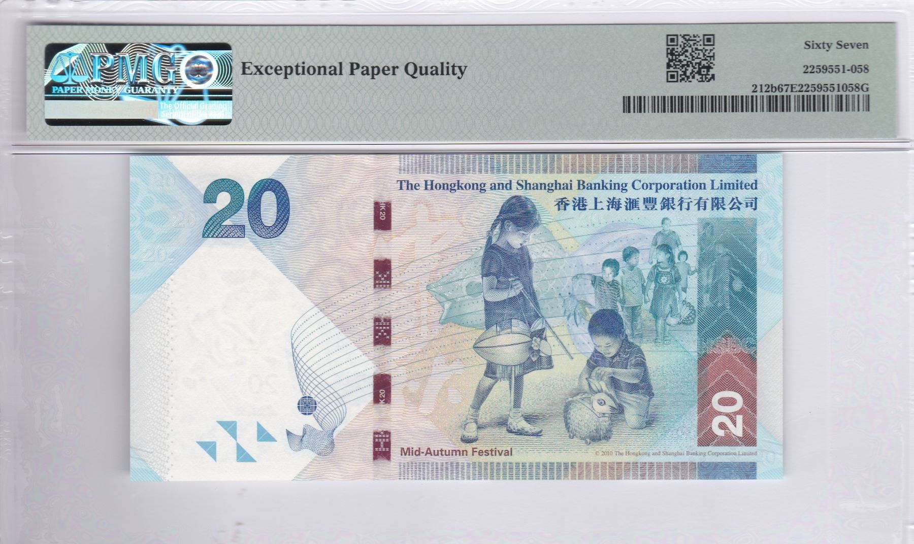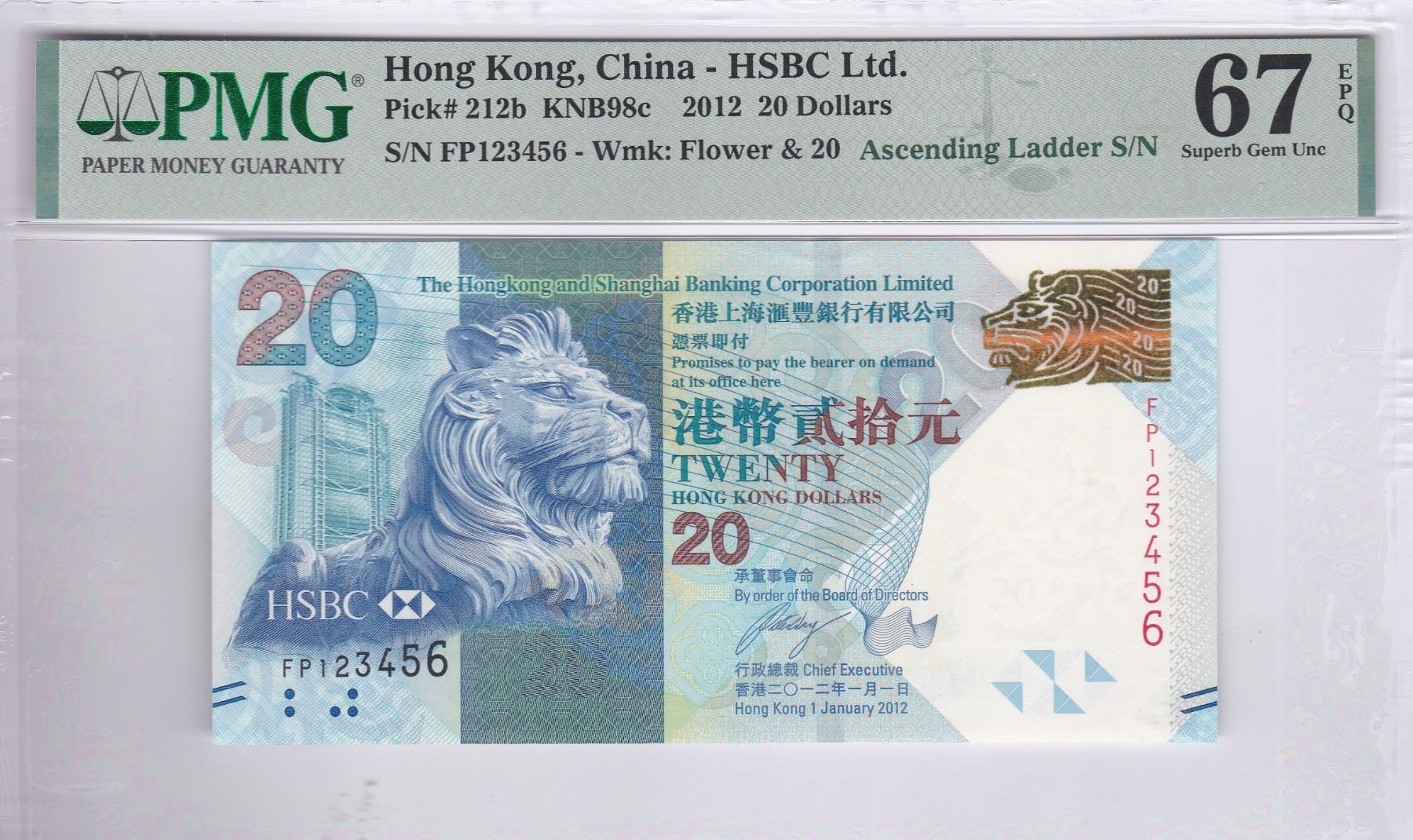 HK & Shanghai Banking Corp., 2012, $20, FP123456. PMG 67EPQ. Ascending Ladder S/N.