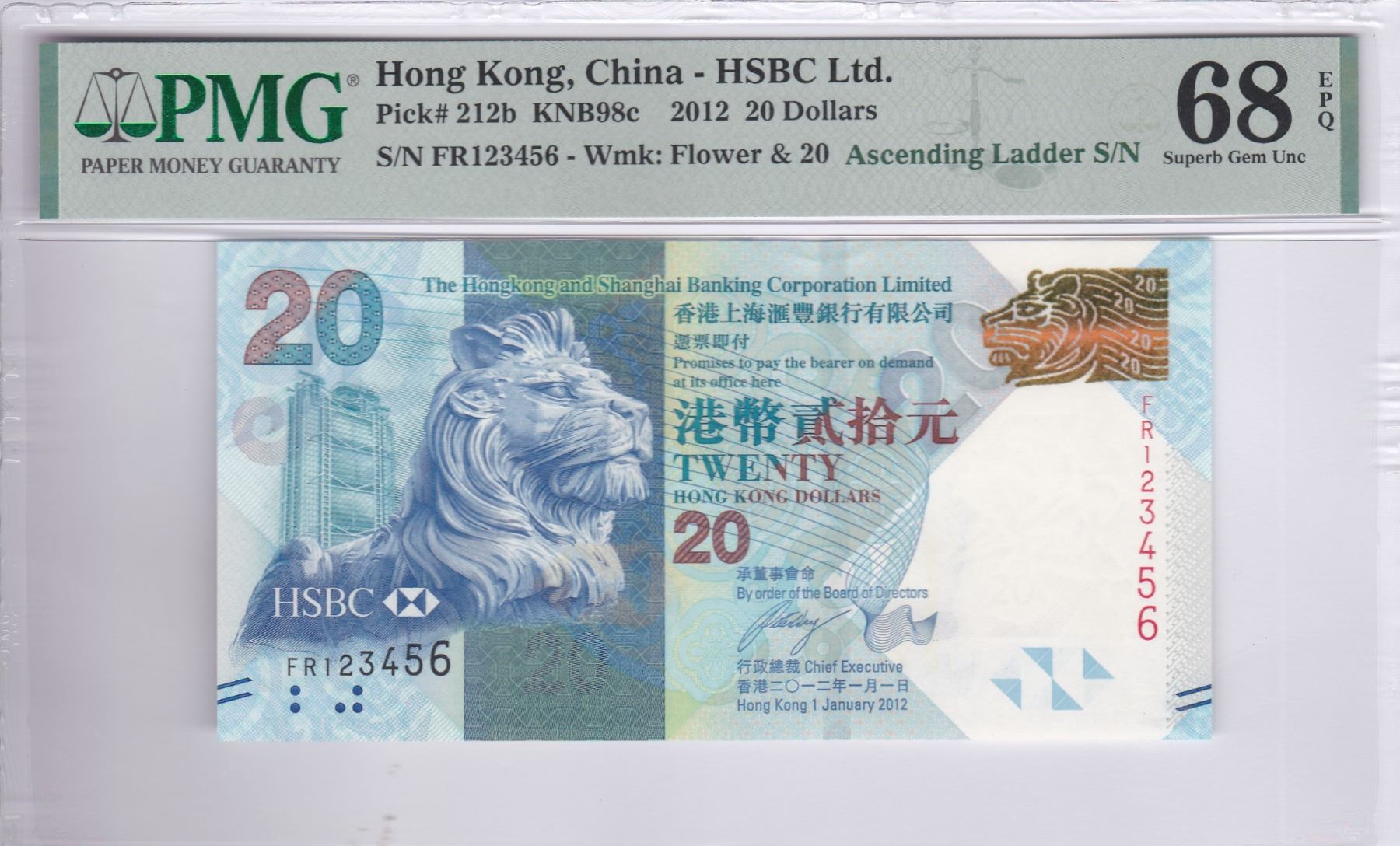 HK & Shanghai Banking Corp., 2012, $20, FR123456. PMG 68EPQ. Ascending Ladder S/N.