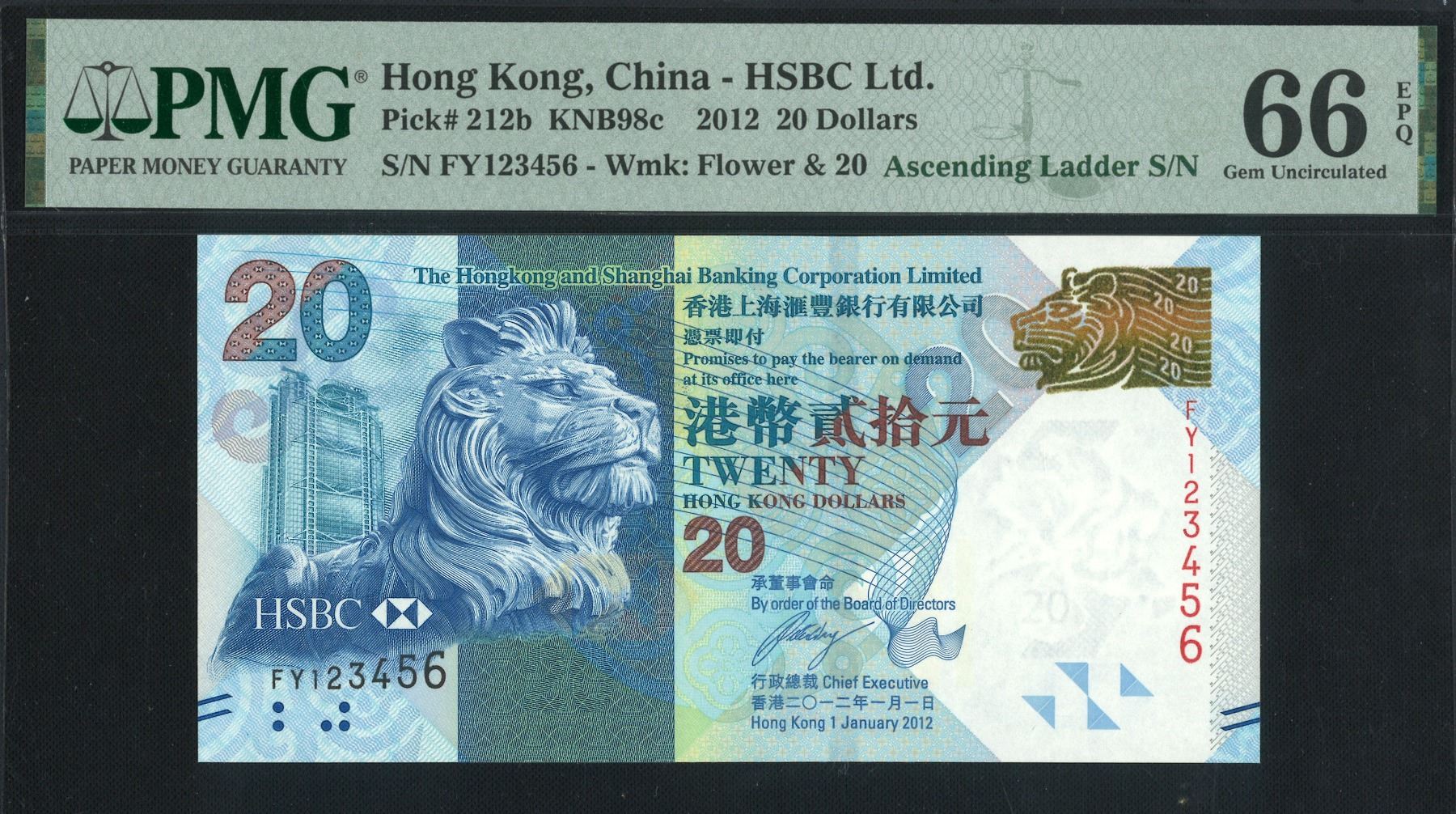 HK & Shanghai Banking Corp., 2012, $20, FY123456. PMG 66EPQ. Ascen木ing S/N.