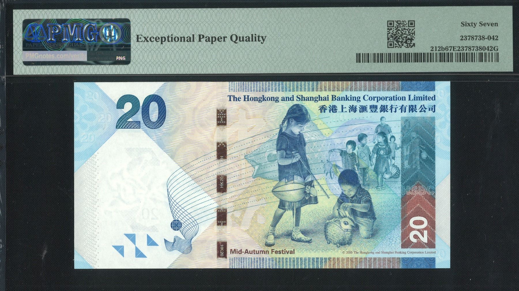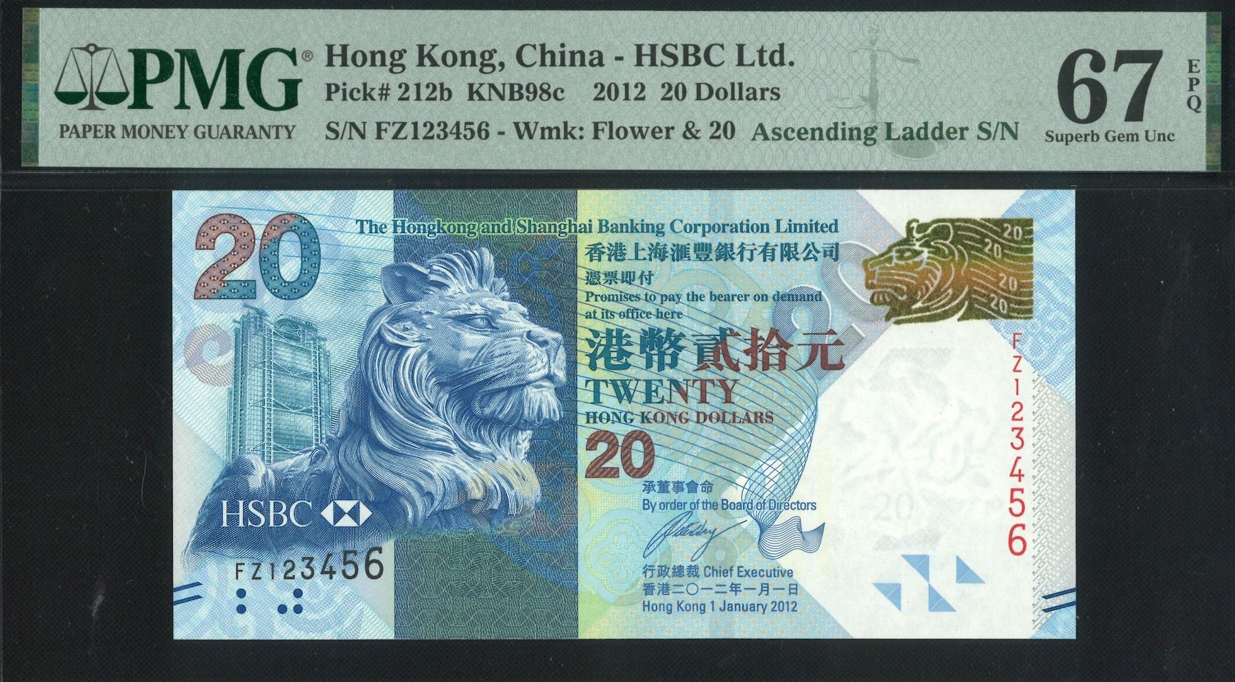 HK & Shanghai Banking Corp., 2012, $20, FZ123456. PMG 67EPQ. Ascending S/N.