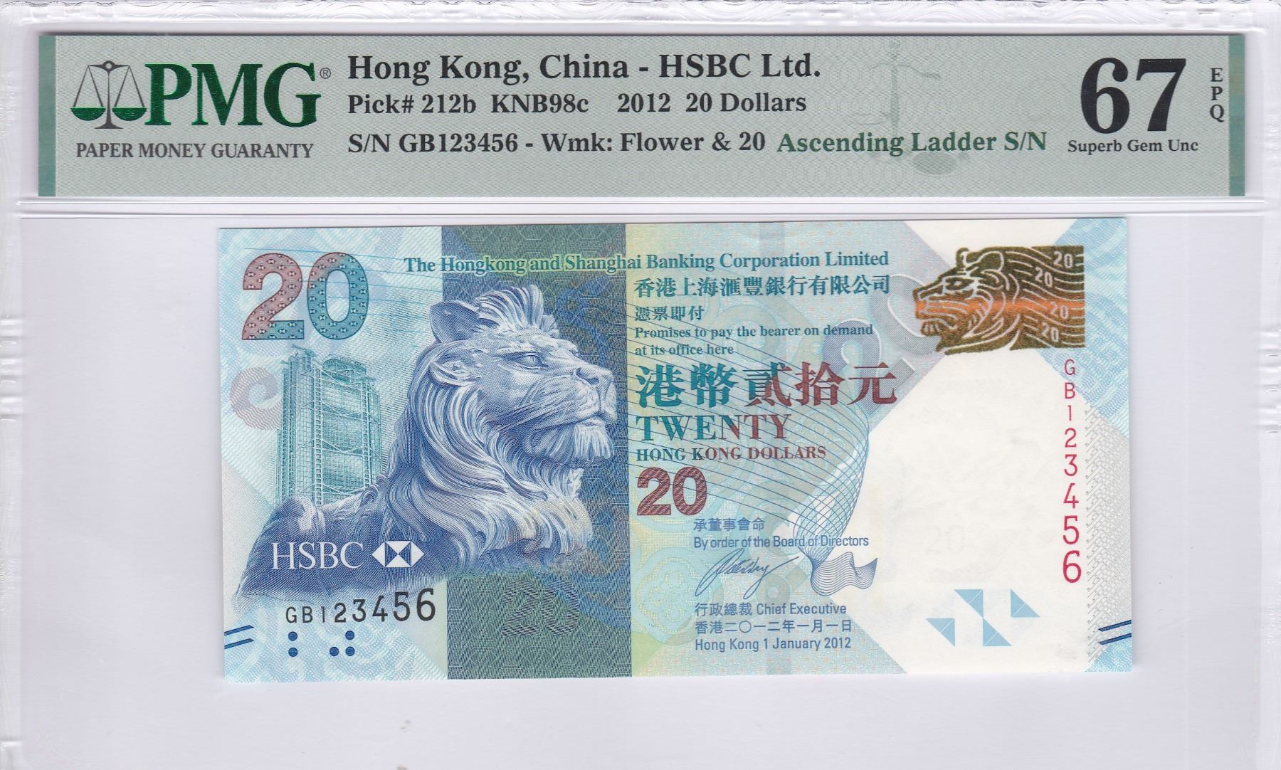 HK & Shanghai Banking Corp., 2012, $20, GB123456. PMG 67EPQ. Ascending Ladder S/N.