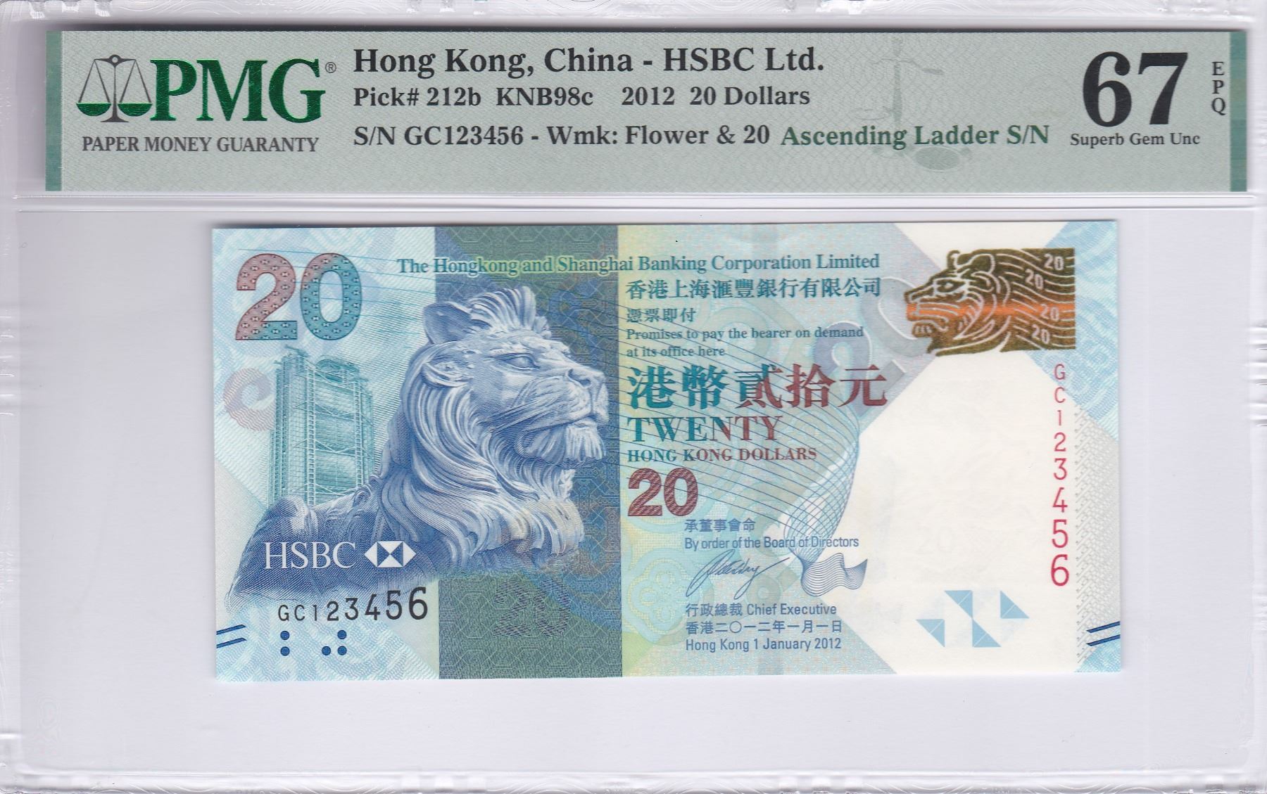 HK & Shanghai Banking Corp., 2012, $20, GC123456. PMG 67EPQ. Ascending Ladder S/N.