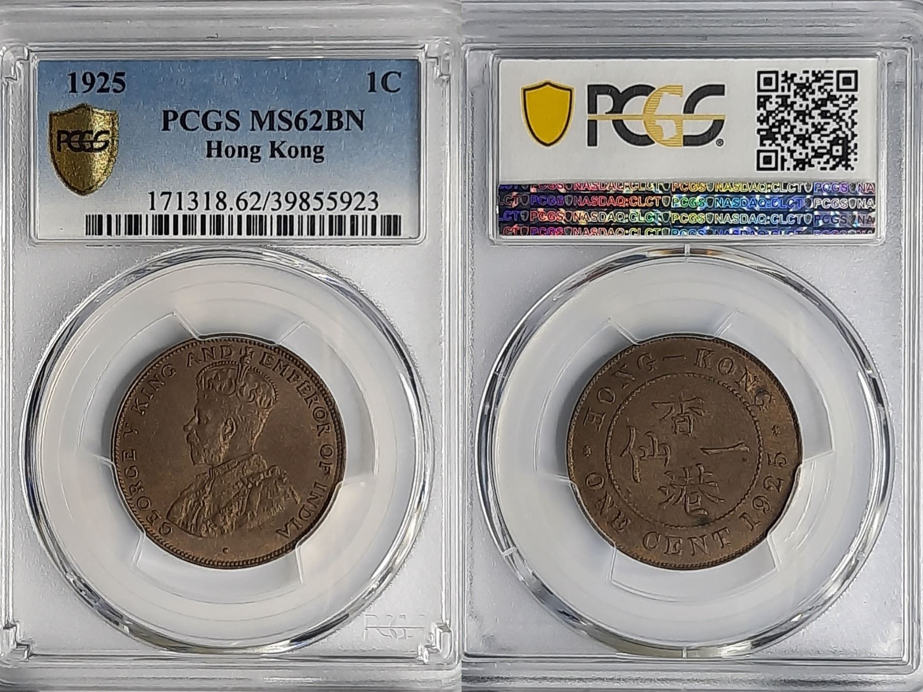 香港壹仙銅幣, 1925, 喬治五世, PCGS MS62BN, Hong Kong, 1 cent bronze coin, 1925, King George V, PCGS MS62BN