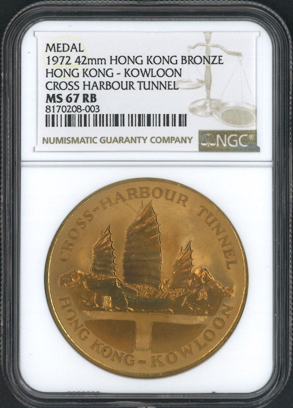 1972, 香港紅隧通車紀念銅章, NGC MS67RB.