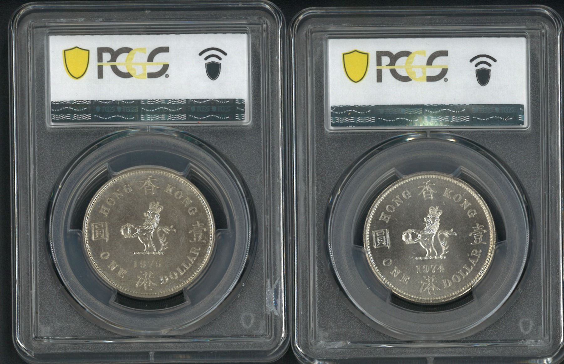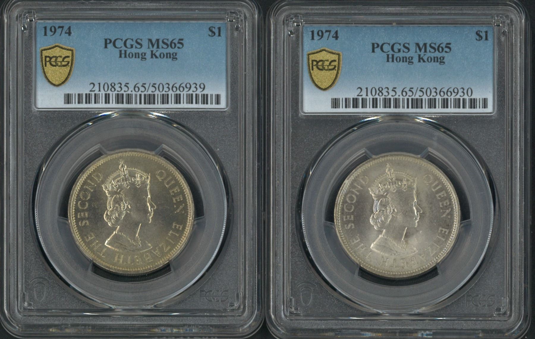 1974, 香港伊莉莎白二世壹圓兩枚, 全評為 PCGS MS65.