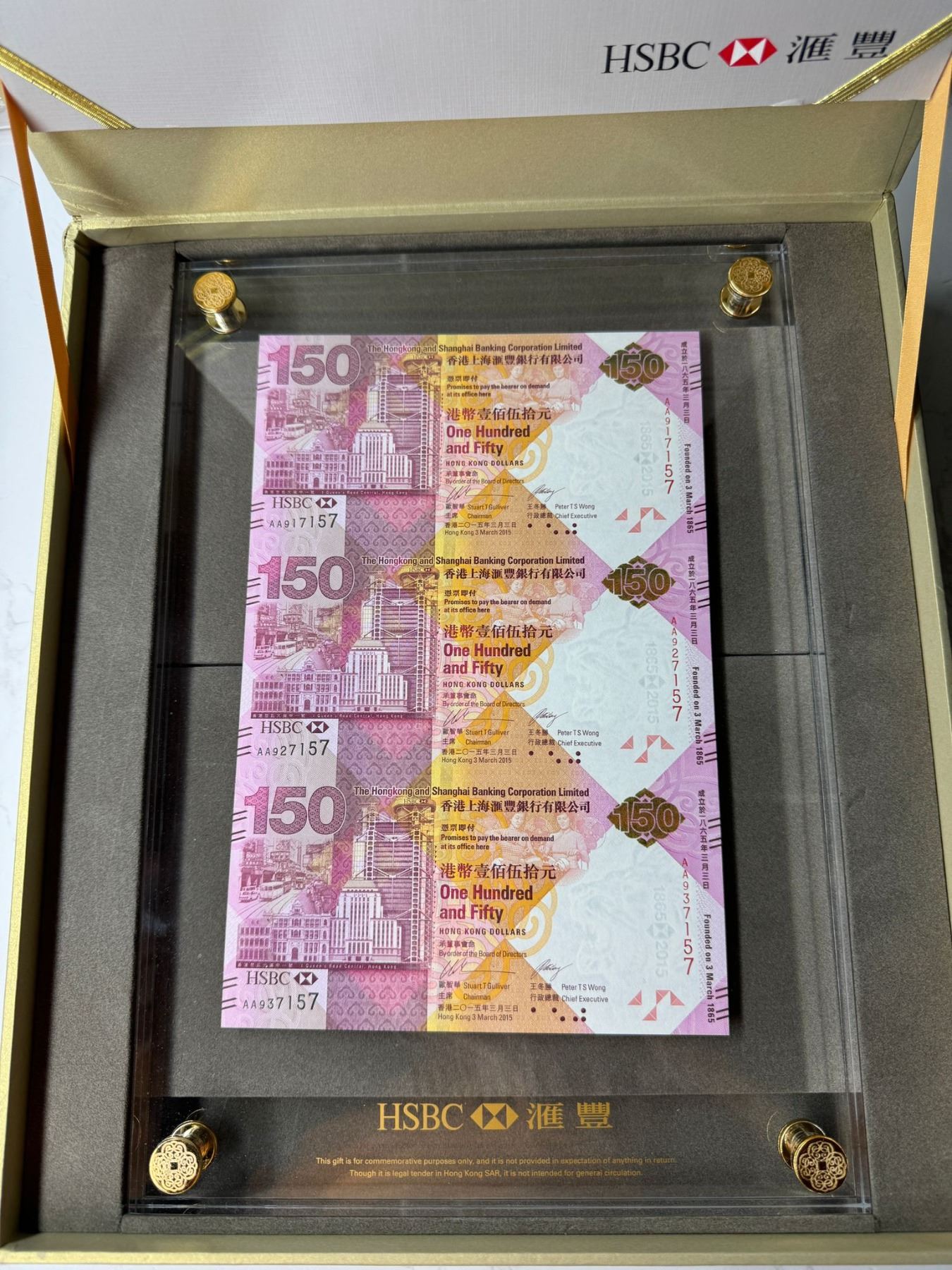 2015, 香港匯豐銀行150週年紀念鈔三連張連精美水晶膠展示架