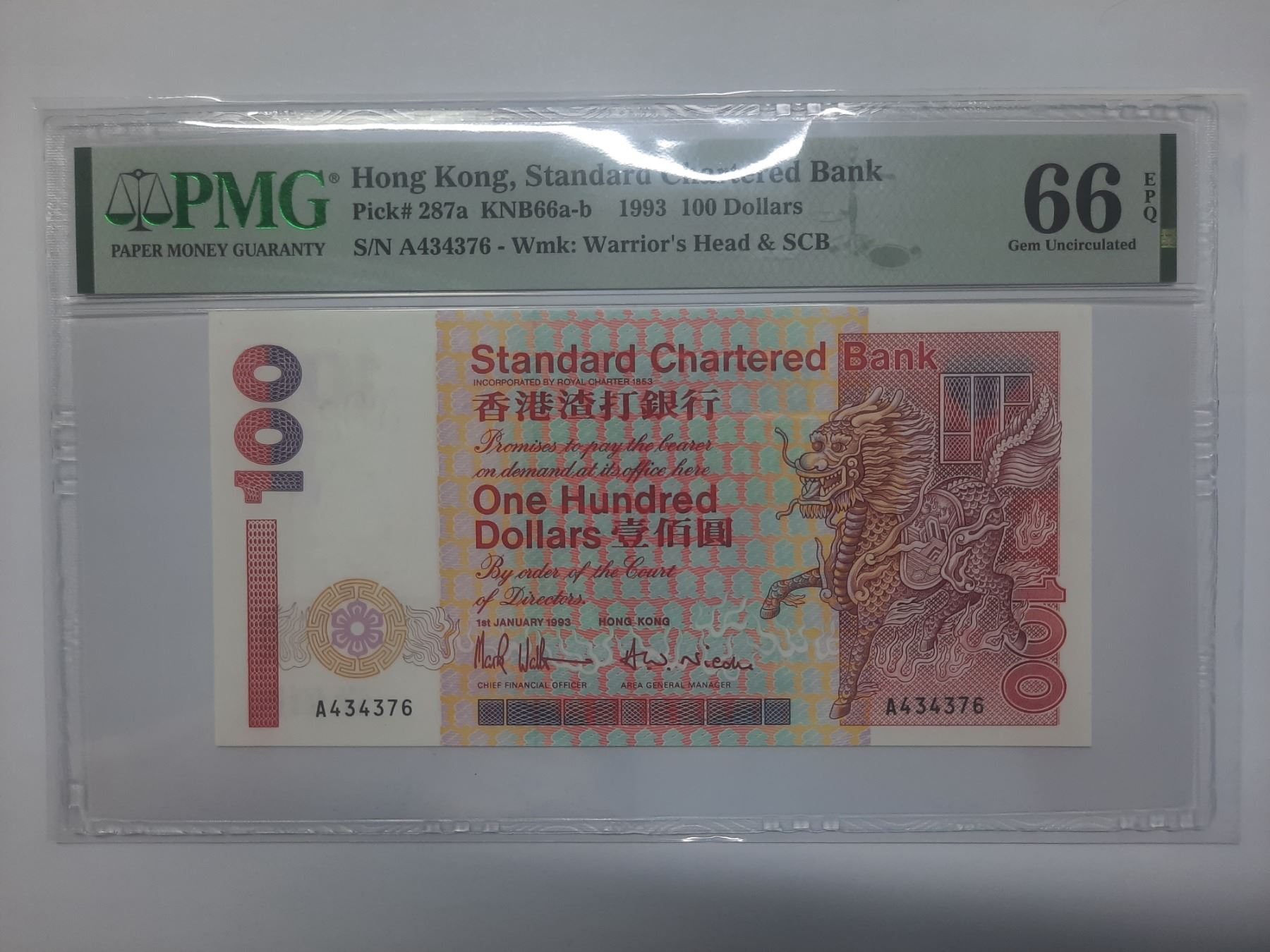 A434376, A 冠, 1993 香港渣打銀行 100 圓, PMG 66EPQ, A434376, Prefix A, 1993 Hong Kong Chartered Bank 100 dollars, PMG 66EPQ