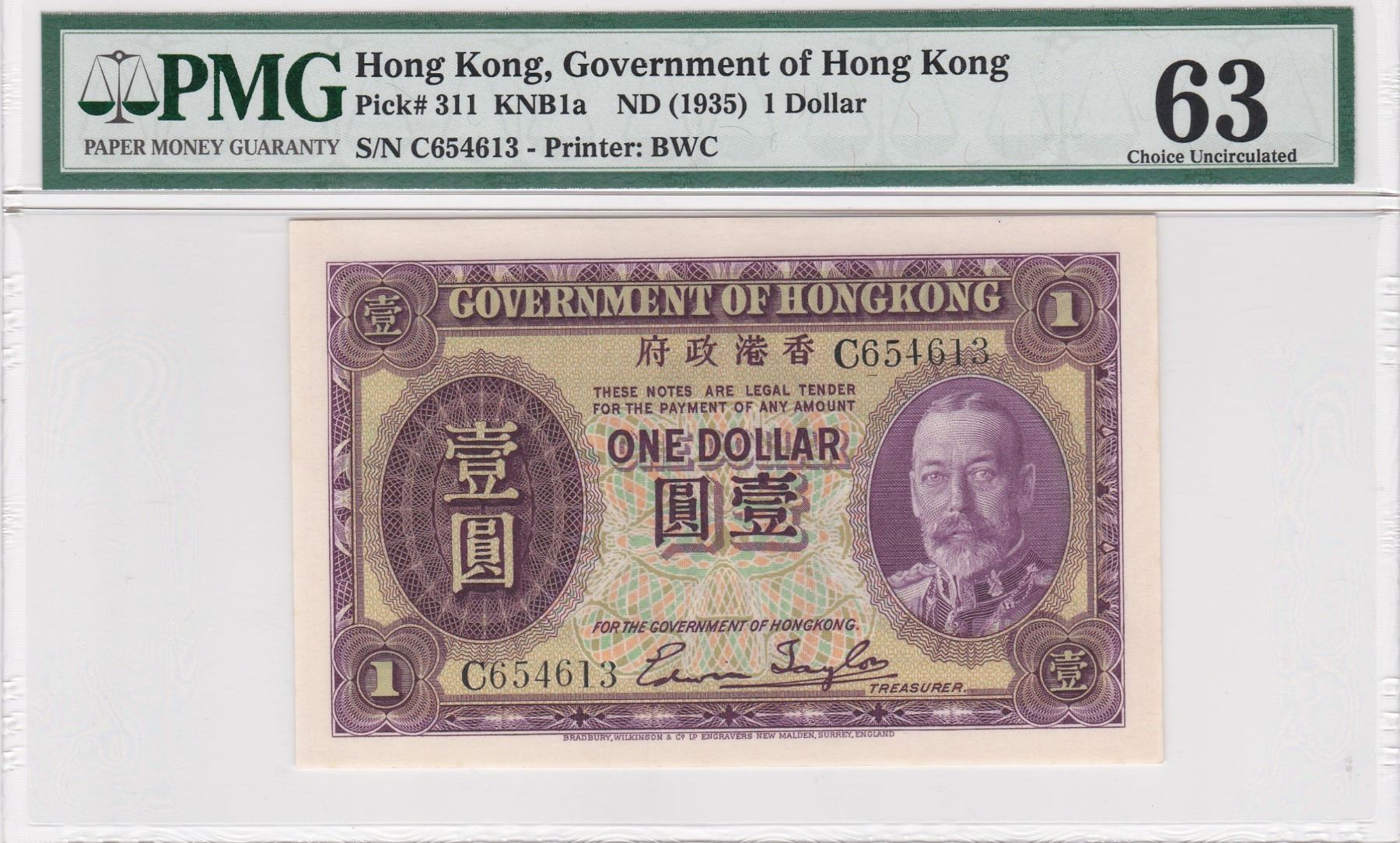 C654613, ND 1935 香港政府 1 圓, PMG 63, C654613, ND 1935 Hong Kong Government 1 dollar, PMG 63